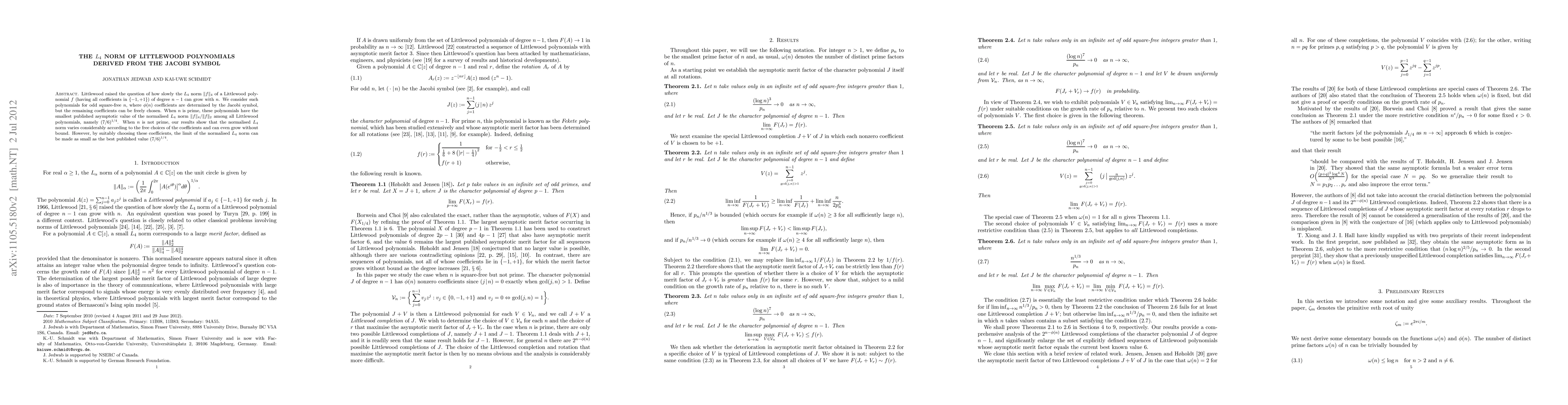 Littlewood polynomials with specific coefficients determined by the Jacobi symbol have an asymptotic L_4 norm of (7/6)^{1/4} for prime n, but varying norms for non-prime n; suitable choices can achieve this minimum.