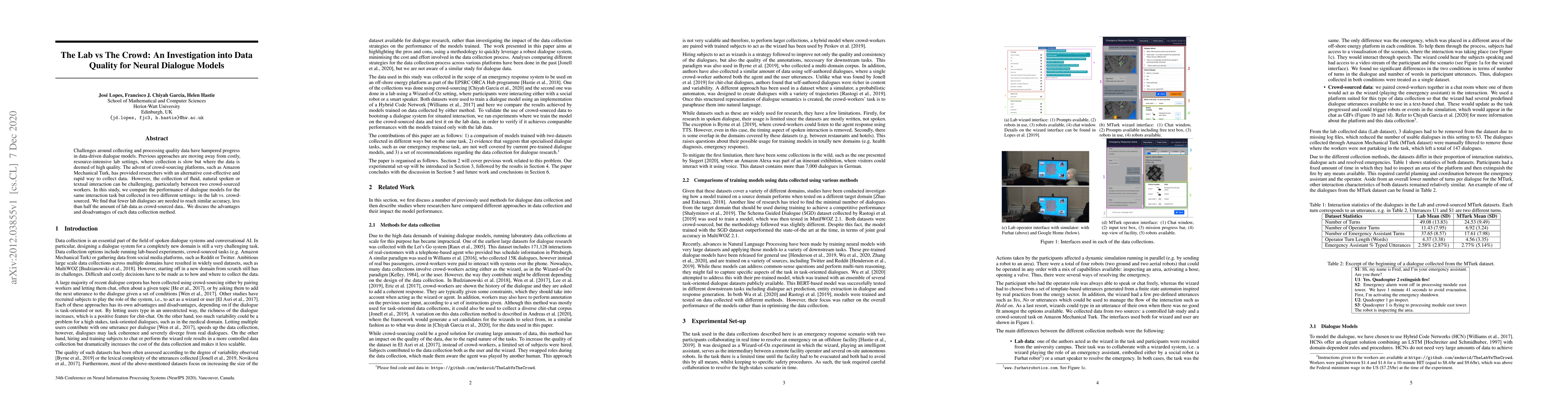 A study comparing data quality for neural dialogue models collected in lab settings vs crowd-sourced platforms shows that fewer lab dialogues are needed to reach similar accuracy, with less than half the amount of lab data required as crowd-sourced data.