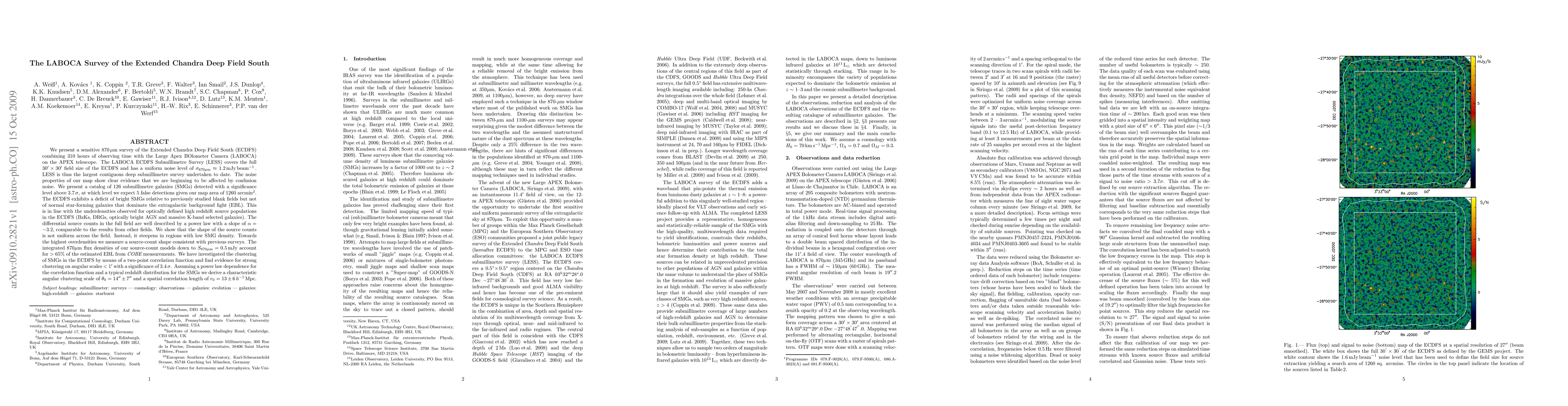 The LABOCA Survey of the Extended Chandra Deep Field South presents a comprehensive 870 micron survey revealing 126 submillimeter galaxies (SMGs), indicating a deficit of bright SMGs in the field compared to blank fields. The survey's findings support the clustering of SMGs and contribute significantly to the estimated extragalactic background light.