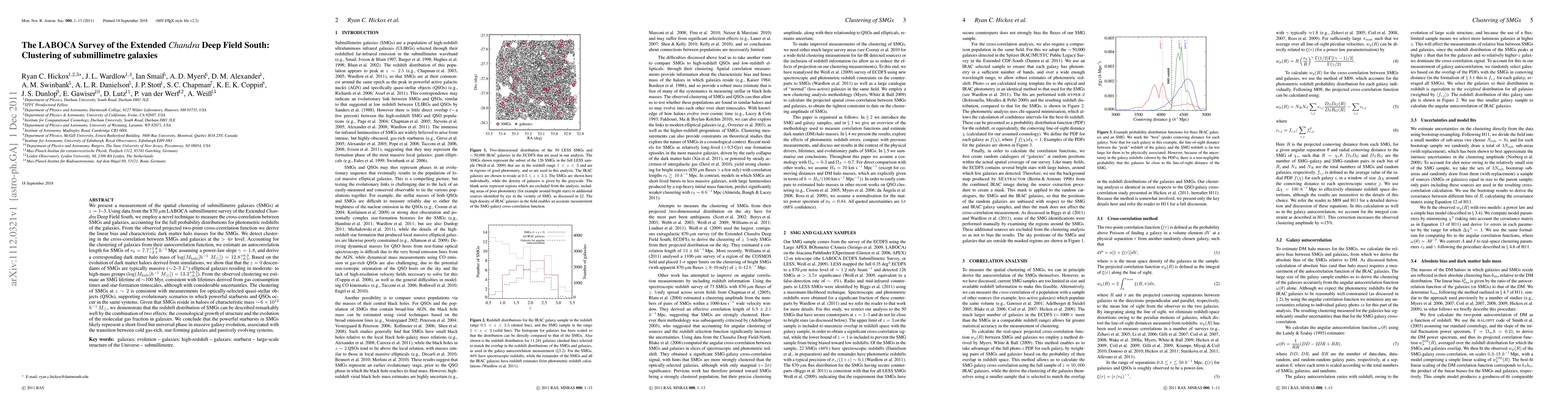 We present a measurement of the spatial clustering of submillimetre galaxies (SMGs) at z = 1-3. Using data from the 870 micron LESS survey, we employ a novel technique to measure the cross-correlation between SMGs and galaxies, accounting for the full probability distributions for photometric redshifts of the galaxies. From the observed projected two-point cross-correlation function we derive the linear bias and characteristic dark matter (DM) halo masses for the SMGs. We detect clustering in the cross-correlation between SMGs and galaxies at the > 4 sigma level. For the SMG autocorrelation we obtain r_0 = 7.7 (+1.8,-2.3) h^-1 Mpc, and derive a corresponding DM halo mass of log(M_halo [h^-1 M_sun]) = 12.8 (+0.3,-0.5). Based on the evolution of DM haloes derived from simulations, we show that that the z = 0 descendants of SMGs are typically massive (~2-3 L*) elliptical galaxies residing in moderate- to high-mass groups (log(M_halo [h^-1 M_sun]) = 13.3 (+0.3,-0.5). From the observed clustering we estimate an SMG lifetime of ~100 Myr, consistent with lifetimes derived from gas consumption times and star-formation timescales, although with considerable uncertainties. The clustering of SMGs at z ~ 2 is consistent with measurements for optically-selected quasi-stellar objects (QSOs), supporting evolutionary scenarios linking starbursts and QSOs. Given that SMGs reside in haloes of characteristic mass ~ 6 x 10^12 h^-1 M_sun, we demonstrate that the redshift distribution of SMGs can be described remarkably well by the combination of two effects: the cosmological growth of structure and the evolution of the molecular gas fraction in galaxies. We conclude that the powerful starbursts in SMGs likely represent a short-lived but universal phase in massive galaxy evolution, associated with the transition between cold gas-rich, star-forming galaxies and passively evolving systems. [Abridged]