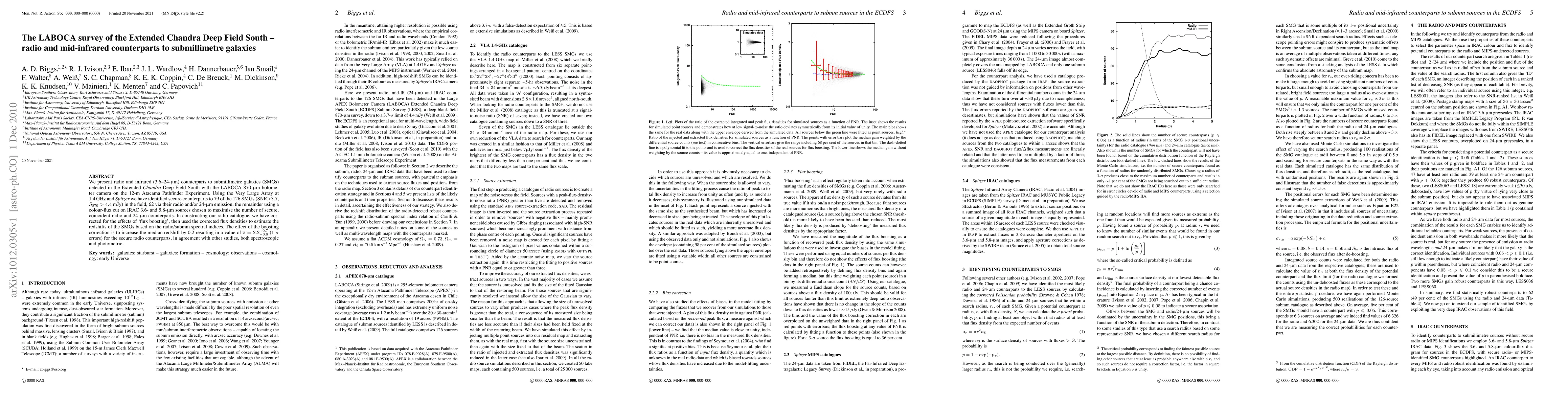 This study identifies radio and mid-infrared counterparts for submillimetre galaxies (SMGs) in the Extended Chandra Deep Field South using LABOCA, VLA, and Spitzer data. Secure counterparts for 79 of 126 SMGs were found, with redshifts estimated at z=2.2 (+0.7-0.8) after correcting for flux boosting.