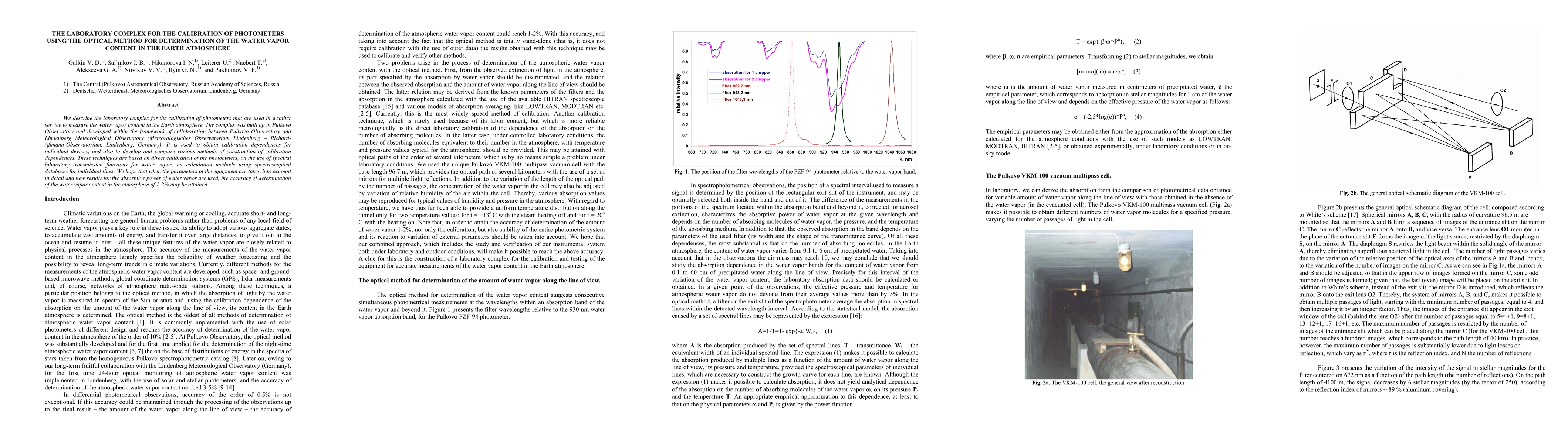 This paper presents a laboratory complex in Pulkovo Observatory for calibrating photometers used in weather services to measure atmospheric water vapor. The collaboration with Lindenberg Meteorological Observatory aims to achieve an accuracy of 1-2% in water vapor content determination using advanced calibration techniques.