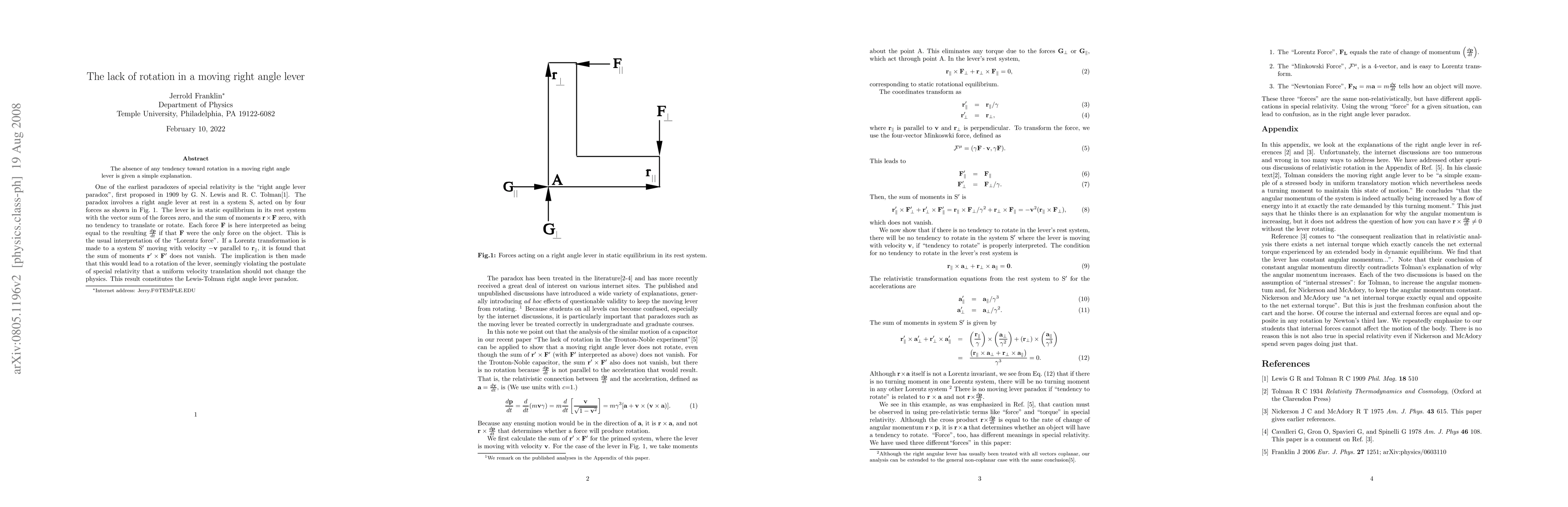 The analysis of the similar motion of a capacitor in the recent paper 'The lack of rotation in the Trouton-Noble experiment' is applied to show that a moving right angle lever does not rotate.