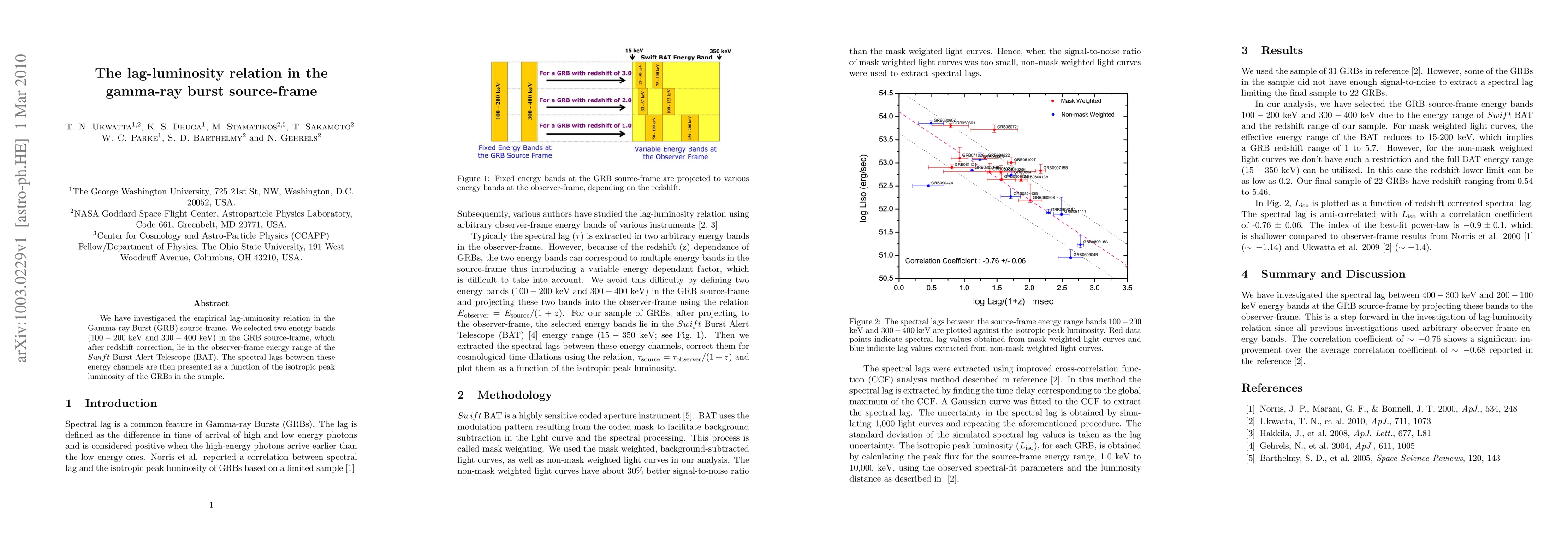 We have investigated the empirical lag-luminosity relation in the Gamma-ray Burst (GRB) source-frame. We selected two energy bands (100-200 keV and 300-400 keV) in the GRB source-frame, which after redshift correction, lie in the observer-frame energy range of the Swift Burst Alert Telescope (BAT). The spectral lags between these energy channels are then presented as a function of the isotropic peak luminosity of the GRBs in the sample.