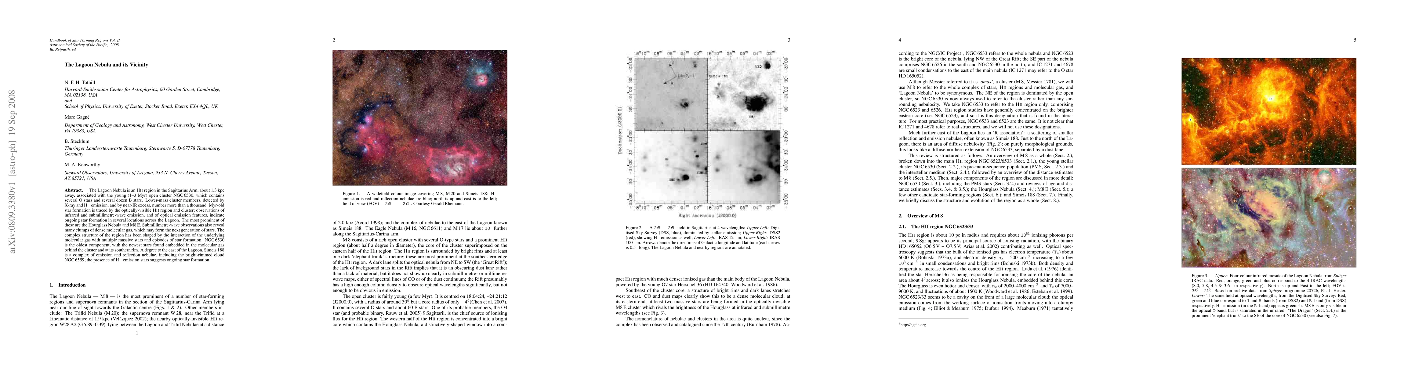 The Lagoon Nebula is an HII region in the Sagittarius Arm, about 1.3 kpc away, associated with the young (1-3 Myr) open cluster NGC 6530, which contains several O stars and several dozen B stars. Lower-mass cluster members, detected by X-ray and H-alpha emission, and by near-IR excess, number more than a thousand. Myr-old star formation is traced by the optically-visible HII region and cluster; observations of infrared and submillimetre-wave emission, and of optical emission features, indicate ongoing star formation in several locations across the Lagoon. The most prominent of these are the Hourglass Nebula and M8E. Submillimetre-wave observations also reveal many clumps of dense molecular gas, which may form the next generation of stars. The complex structure of the region has been shaped by the interaction of the underlying molecular gas with multiple massive stars and episodes of star formation. NGC 6530 is the oldest component, with the newest stars found embedded in the molecular gas behind the cluster and at its southern rim. A degree to the east of the Lagoon, Simeis 188 is a complex of emission and reflection nebulae, including the bright-rimmed cloud NGC 6559; the presence of H-alpha emission stars suggests ongoing star formation.