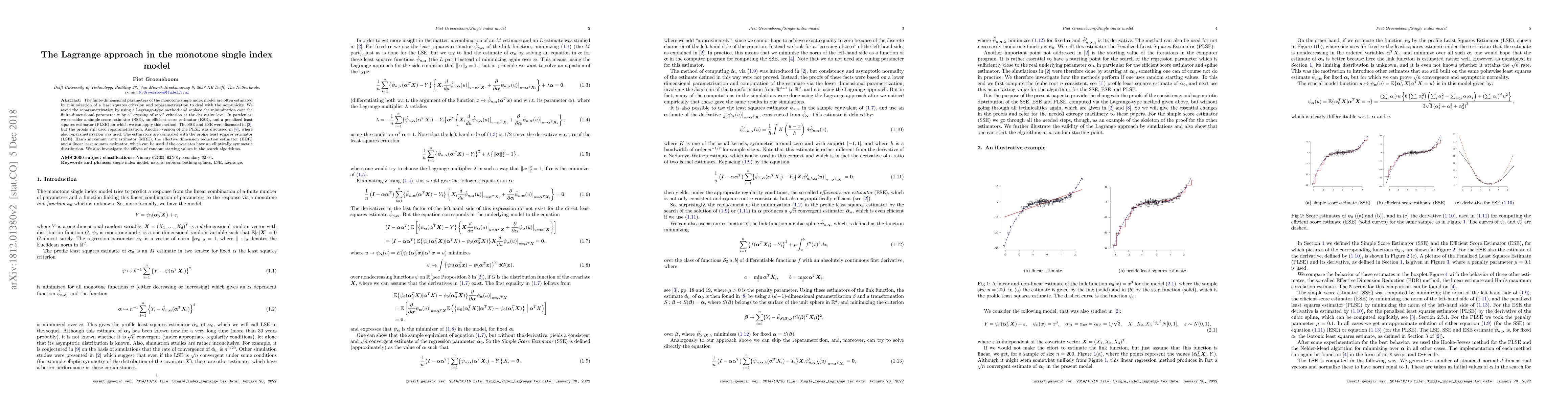 The finite-dimensional parameters of the monotone single index model are often estimated by minimization of a least squares criterion and reparametrization to deal with the non-unicity. We avoid the reparametrization by using a Lagrange-type method and replace the minimization over the finite-dimensional parameter alpha by a `crossing of zero' criterion at the derivative level. In particular, we consider a simple score estimator (SSE), an efficient score estimator (ESE), and a penalized least squares estimator (PLSE) for which we can apply this method. The SSE and ESE were discussed in Balabdaoui, Groeneboom and Hendrickx (2018}, but the proofs still used reparametrization. Another version of the PLSE was discussed in Kuchibhotla and Patra (2017), where also reparametrization was used. The estimators are compared with the profile least squares estimator (LSE), Han's maximum rank estimator (MRE), the effective dimension reduction estimator (EDR) and a linear least squares estimator, which can be used if the covariates have an elliptically symmetric distribution. We also investigate the effects of random starting values in the search algorithms.