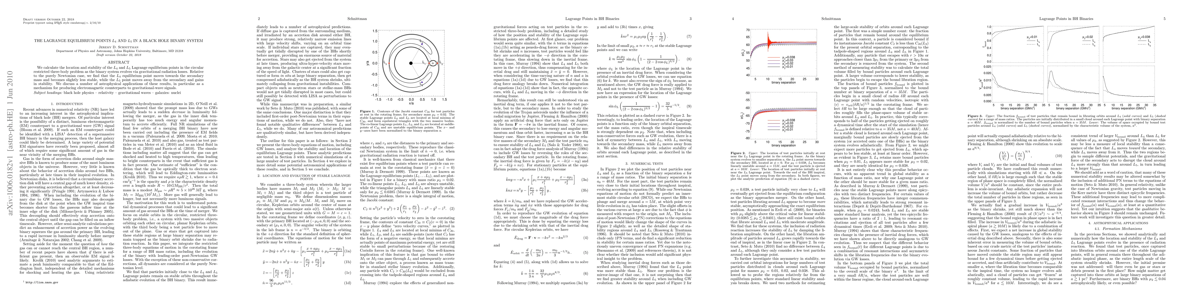 This paper investigates the evolution of L_4 and L_5 Lagrange points in a black hole binary system due to gravitational radiation, finding that L_4 moves towards the secondary mass and becomes less stable, while L_5 moves away and gains stability. These findings have implications for generating electromagnetic signals accompanying gravitational waves.