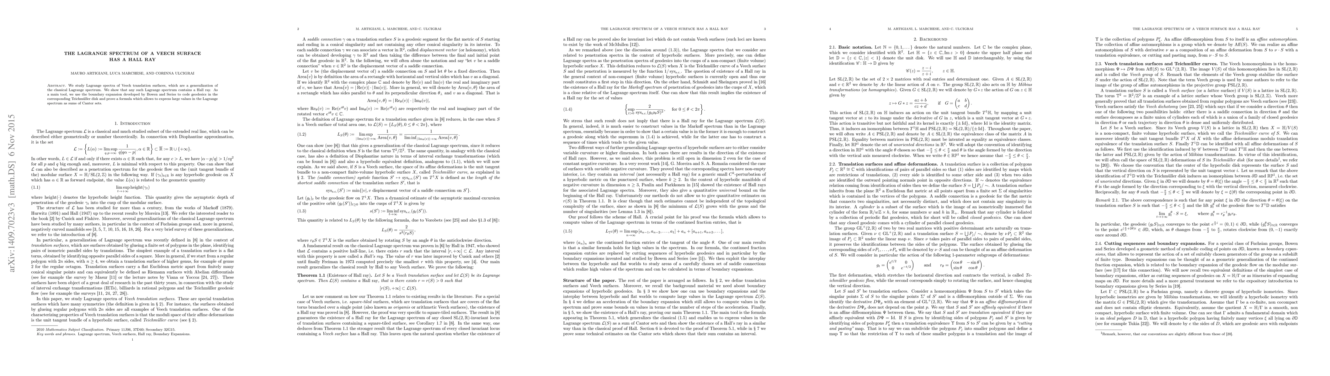 We study Lagrange spectra of Veech translation surfaces, which are a generalization of the classical Lagrange spectrum. We show that any such Lagrange spectrum contains a Hall ray. As a main tool, we use the boundary expansion developed by Bowen and Series to code geodesics in the corresponding Teichm\"uller disk and prove a formula which allows to express large values in the Lagrange spectrum as sums of Cantor sets.