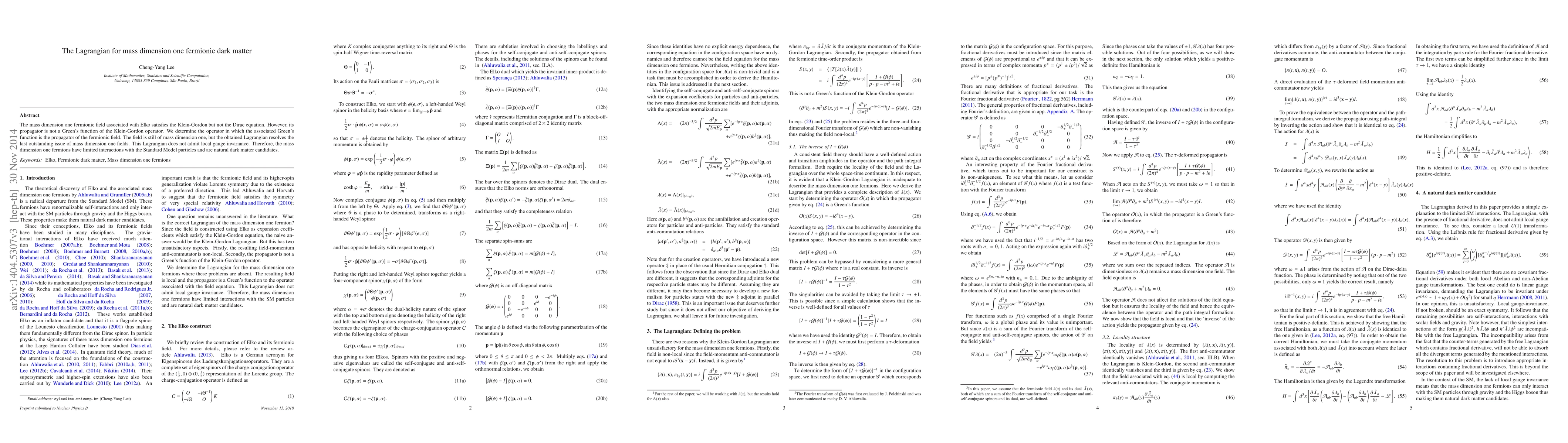 The research derives a Lagrangian for mass dimension one fermionic dark matter using Elko fields, which satisfy the Klein-Gordon equation but not the Dirac equation. It introduces a new operator whose Green's function is the propagator of the fermionic field, ensuring mass dimension one while resolving outstanding issues.
