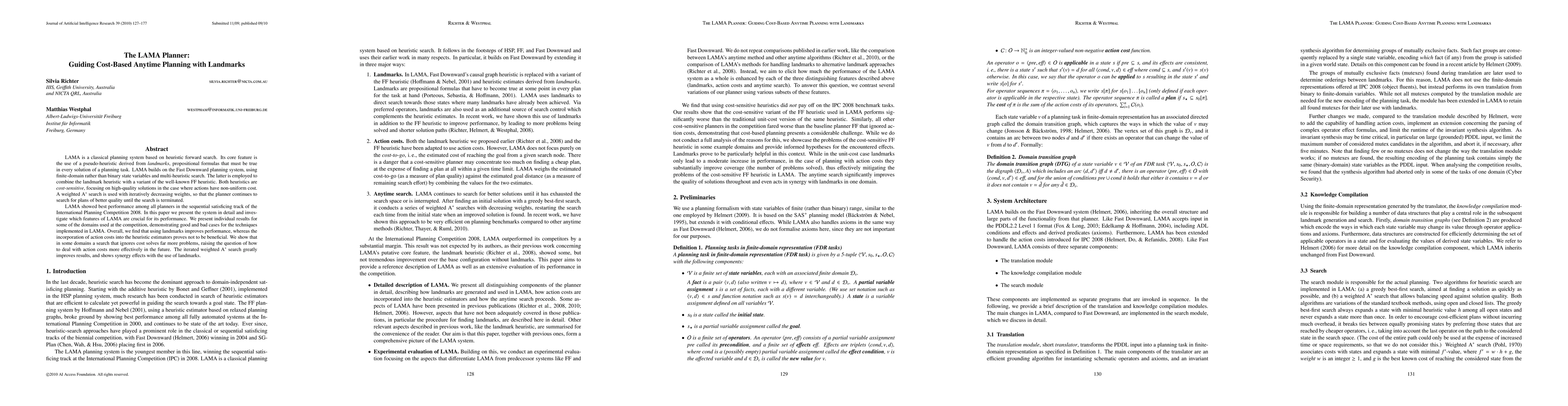 LAMA is a classical planning system based on heuristic forward search. Its core feature is the use of a pseudo-heuristic derived from landmarks, propositional formulas that must be true in every solution of a planning task. LAMA builds on the Fast Downward planning system, using finite-domain rather than binary state variables and multi-heuristic search. The latter is employed to combine the landmark heuristic with a variant of the well-known FF heuristic. Both heuristics are cost-sensitive, focusing on high-quality solutions in the case where actions have non-uniform cost. A weighted A* search is used with iteratively decreasing weights, so that the planner continues to search for plans of better quality until the search is terminated. LAMA showed best performance among all planners in the sequential satisficing track of the International Planning Competition 2008. In this paper we present the system in detail and investigate which features of LAMA are crucial for its performance. We present individual results for some of the domains used at the competition, demonstrating good and bad cases for the techniques implemented in LAMA. Overall, we find that using landmarks improves performance, whereas the incorporation of action costs into the heuristic estimators proves not to be beneficial. We show that in some domains a search that ignores cost solves far more problems, raising the question of how to deal with action costs more effectively in the future. The iterated weighted A* search greatly improves results, and shows synergy effects with the use of landmarks.