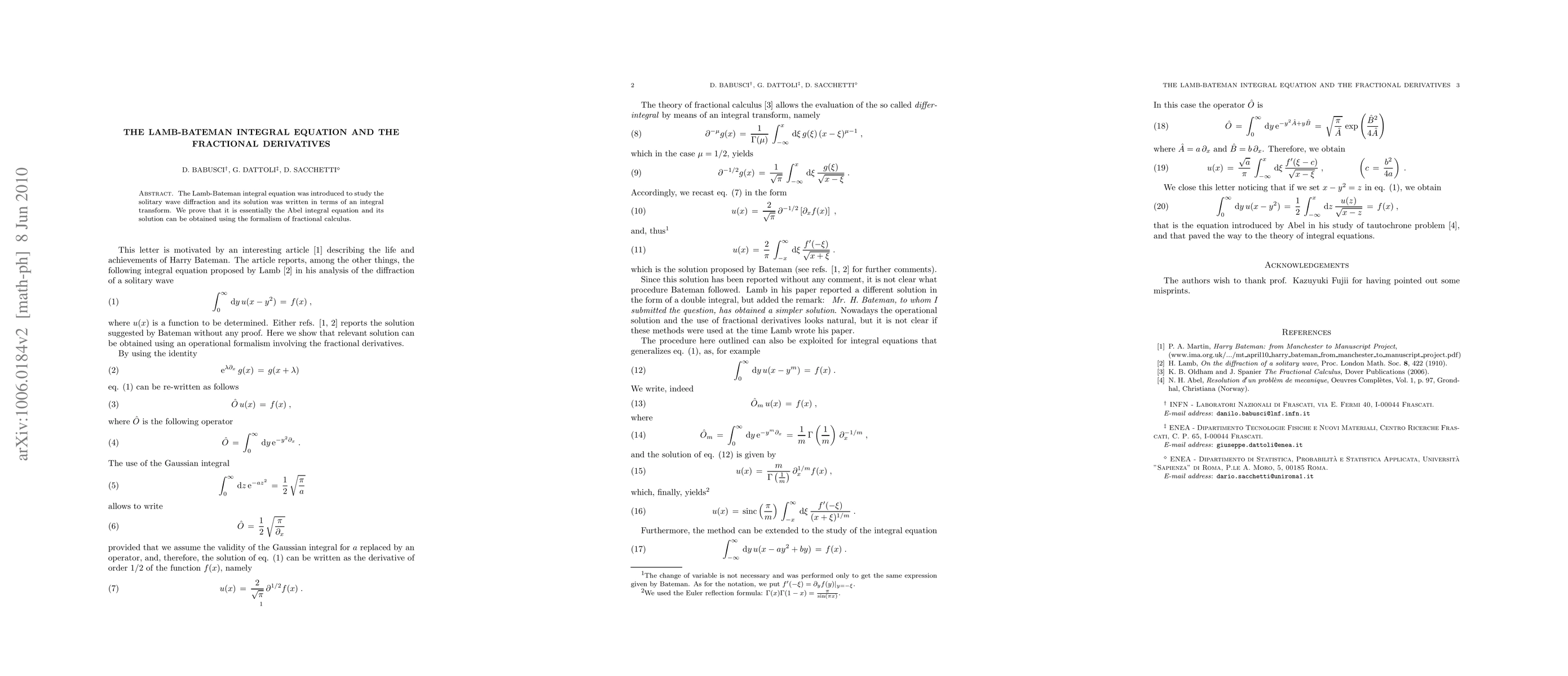The Lamb-Bateman integral equation was introduced to study the solitary wave diffraction and its solution was written in terms of an integral transform. We prove that it is essentially the Abel integral equation and its solution can be obtained using the formalism of fractional calculus.