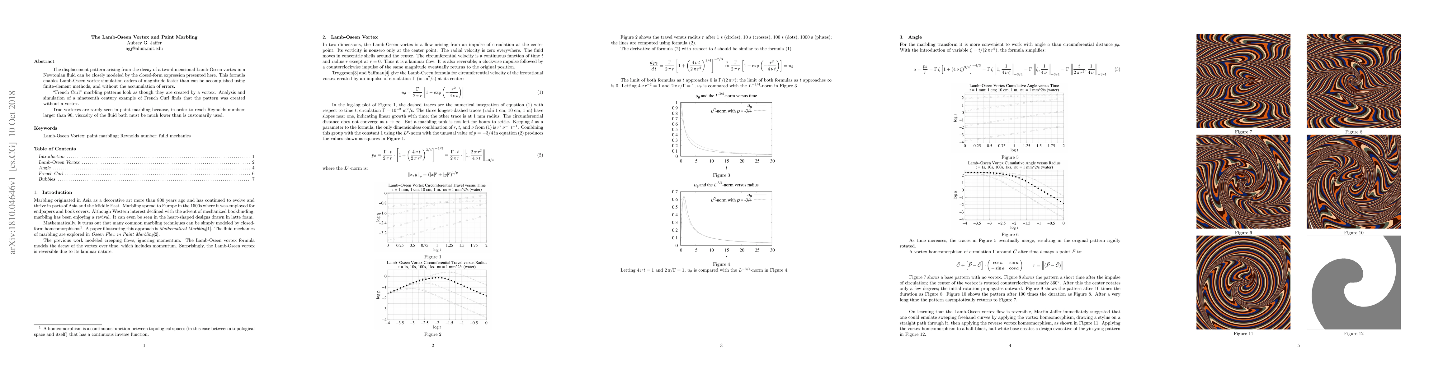 The displacement pattern arising from the decay of a two-dimensional Lamb-Oseen vortex in a Newtonian fluid can be closely modeled by the closed-form expression presented here. This formula enables Lamb-Oseen vortex simulation orders of magnitude faster than can be accomplished using finite-element methods, and without the accumulation of errors. "French Curl" marbling patterns look as though they are created by a vortex. Analysis and simulation of a nineteenth century example of French Curl finds that the pattern was created without a vortex. True vortexes are rarely seen in paint marbling because, in order to reach Reynolds numbers larger than 90, viscosity of the fluid bath must be much lower than is customarily used.