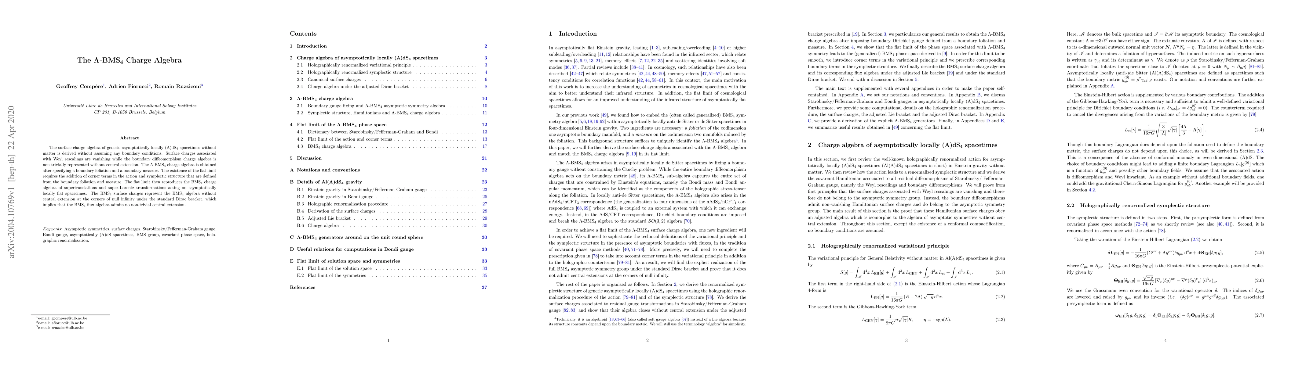 The surface charge algebra of generic asymptotically locally (A)dS$_4$ spacetimes without matter is derived without assuming any boundary conditions. Surface charges associated with Weyl rescalings are vanishing while the boundary diffeomorphism charge algebra is non-trivially represented without central extension. The $\Lambda$-BMS$_4$ charge algebra is obtained after specifying a boundary foliation and a boundary measure. The existence of the flat limit requires the addition of corner terms in the action and symplectic structure that are defined from the boundary foliation and measure. The flat limit then reproduces the BMS$_4$ charge algebra of supertranslations and super-Lorentz transformations acting on asymptotically locally flat spacetimes. The BMS$_4$ surface charges represent the BMS$_4$ algebra without central extension at the corners of null infinity under the standard Dirac bracket, which implies that the BMS$_4$ flux algebra admits no non-trivial central extension.