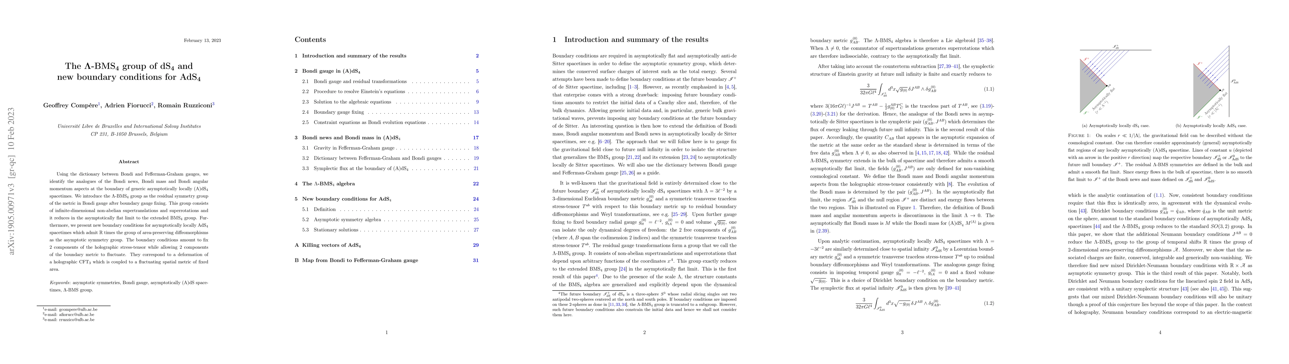 Using the dictionary between Bondi and Fefferman-Graham gauges, we identify the analogues of the Bondi news, Bondi mass and Bondi angular momentum aspects at the boundary of generic asymptotically locally (A)dS$_4$ spacetimes. We introduce the $\Lambda$-BMS$_4$ group as the residual symmetry group of the metric in Bondi gauge after boundary gauge fixing. This group consists of infinite-dimensional non-abelian supertranslations and superrotations and it reduces in the asymptotically flat limit to the extended BMS$_4$ group. Furthermore, we present new boundary conditions for asymptotically locally AdS$_4$ spacetimes which admit $\mathbb R$ times the group of area-preserving diffeomorphisms as the asymptotic symmetry group. The boundary conditions amount to fix 2 components of the holographic stress-tensor while allowing 2 components of the boundary metric to fluctuate. They correspond to a deformation of a holographic CFT$_3$ which is coupled to a fluctuating spatial metric of fixed area.