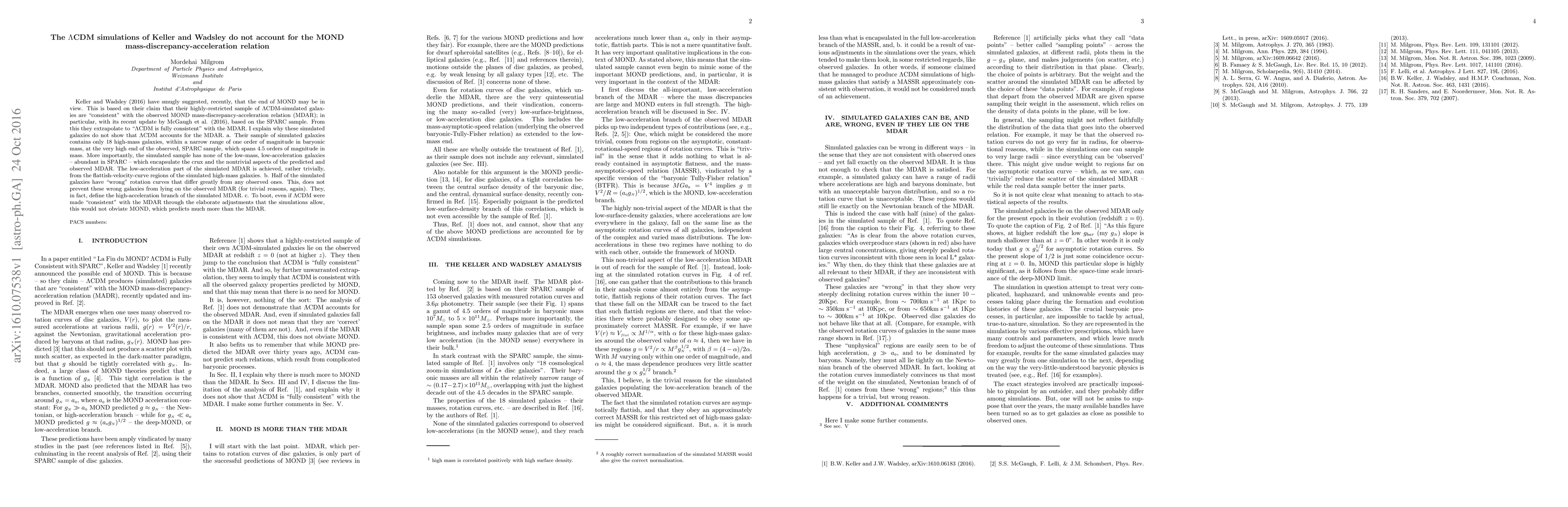 Keller and Wadsley (2016) have smugly suggested, recently, that the end of MOND may be in view. This is based on their claim that their highly-restricted sample of $\Lambda$CDM-simulated galaxies are "consistent" with the observed MOND mass-discrepancy-acceleration relation (MDAR), in particular, with its recent update by McGaugh et al. (2016), based on the SPARC sample. From this they extrapolate to "$\Lambda$CDM is fully consistent" with the MDAR. I explain why these simulated galaxies do not show that $\Lambda$CDM accounts for the MDAR. a. Their sample of simulated galaxies contains only 18 high-mass galaxies, within a narrow range of one order of magnitude in baryonic mass, at the very high end of the observed, SPARC sample, which spans 4.5 orders of magnitude in mass. More importantly, the simulated sample has none of the low-mass, low-acceleration galaxies -- abundant in SPARC -- which encapsulate the crux and the nontrivial aspects of the predicted and observed MDAR. The low-acceleration part of the simulated MDAR is achieved, rather trivially, from the flattish-velocity-curve regions of the simulated high-mass galaxies. b. Half of the simulated galaxies have "wrong" rotation curves that differ greatly from any observed ones. This, does not prevent these wrong galaxies from lying on the observed MDAR (for trivial reasons, again). They, in fact, define the high-acceleration branch of the simulated MDAR. c. To boot, even if $\Lambda$CDM were made "consistent" with the MDAR through the elaborate adjustments that the simulations allow, this would not obviate MOND, which predicts much more than the MDAR.