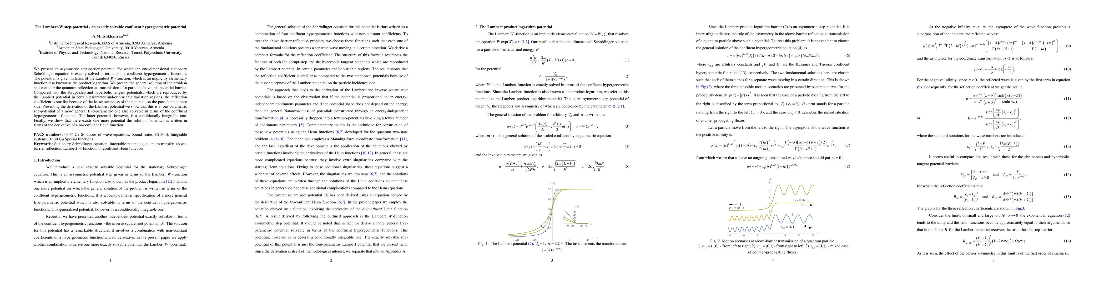 We present an asymmetric step-barrier potential for which the one-dimensional stationary Schr\"odinger equation is exactly solved in terms of the confluent hypergeometric functions. The potential is given in terms of the Lambert -function, which is an implicitly elementary function also known as the product logarithm. We present the general solution of the problem and consider the quantum reflection at transmission of a particle above this potential barrier. Compared with the abrupt-step and hyperbolic tangent potentials, which are reproduced by the Lambert potential in certain parameter and/or variable variation regions, the reflection coefficient is smaller because of the lesser steepness of the potential on the particle incidence side. Presenting the derivation of the Lambert potential we show that this is a four-parametric sub-potential of a more general five-parametric one also solvable in terms of the confluent hypergeometric functions. The latter potential, however, is a conditionally integrable one. Finally, we show that there exists one more potential the solution for which is written in terms of the derivative of a bi-confluent Heun function.
