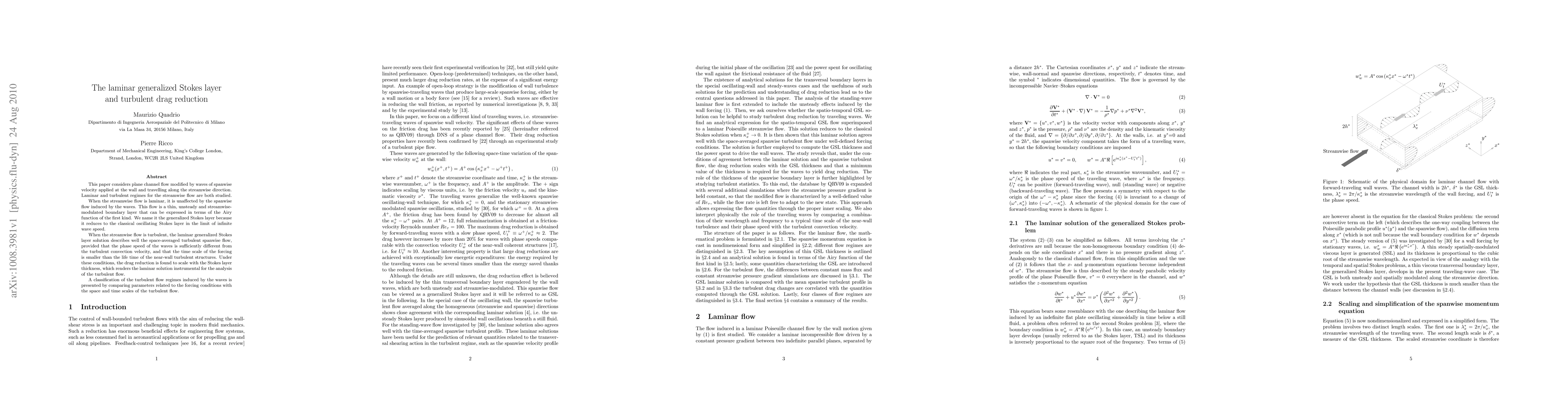 This paper investigates plane channel flow with spanwise waves, analyzing both laminar and turbulent regimes. It introduces the laminar generalized Stokes layer, a thin, unsteady boundary layer that reduces drag when the streamwise flow is turbulent, scaling drag reduction with the layer's thickness.