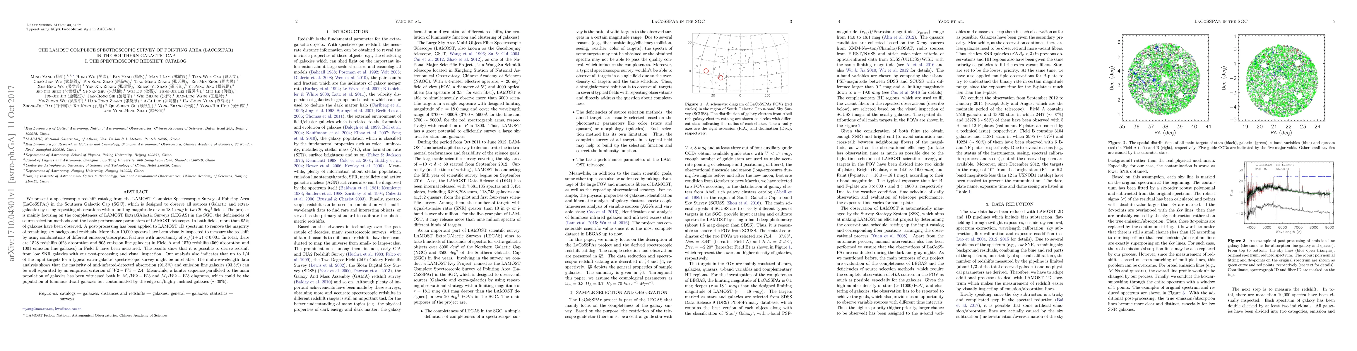 We present a spectroscopic redshift catalog from the LAMOST Complete Spectroscopic Survey of Pointing Area (LaCoSSPAr) in the Southern Galactic Cap (SGC), which is designed to observe all sources (Galactic and extra-galactic) by using repeating observations with a limiting magnitude of $r=18.1~mag$ in two $20~deg^2$ fields. The project is mainly focusing on the completeness of LAMOST ExtraGAlactic Surveys (LEGAS) in the SGC, the deficiencies of source selection methods and the basic performance parameters of LAMOST telescope. In both fields, more than 95% of galaxies have been observed. A post-processing has been applied to LAMOST 1D spectrum to remove the majority of remaining sky background residuals. More than 10,000 spectra have been visually inspected to measure the redshift by using combinations of different emission/absorption features with uncertainty of $\sigma_{z}/(1+z)<0.001$. In total, there are 1528 redshifts (623 absorption and 905 emission line galaxies) in Field A and 1570 redshifts (569 absorption and 1001 emission line galaxies) in Field B have been measured. The results show that it is possible to derive redshift from low SNR galaxies with our post-processing and visual inspection. Our analysis also indicates that up to 1/4 of the input targets for a typical extra-galactic spectroscopic survey might be unreliable. The multi-wavelength data analysis shows that the majority of mid-infrared-detected absorption (91.3%) and emission line galaxies (93.3%) can be well separated by an empirical criterion of $W2-W3=2.4$. Meanwhile, a fainter sequence paralleled to the main population of galaxies has been witnessed both in $M_r$/$W2-W3$ and $M_*$/$W2-W3$ diagrams, which could be the population of luminous dwarf galaxies but contaminated by the edge-on/highly inclined galaxies ($\sim30\%$).