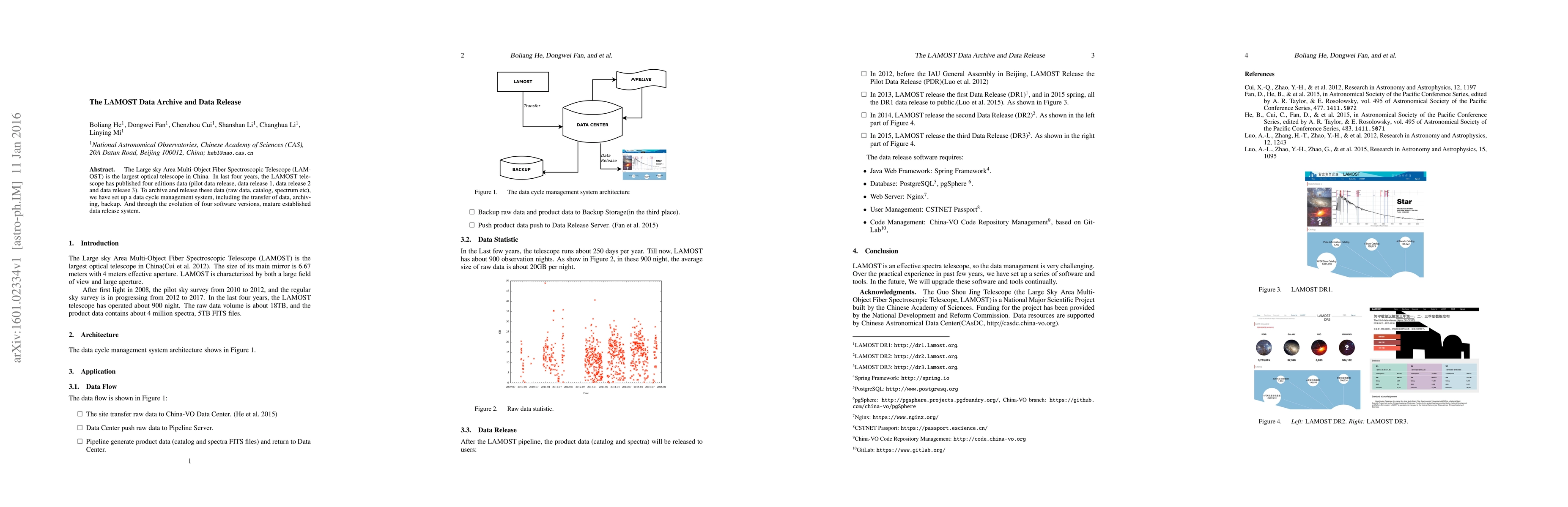 The LAMOST telescope in China has released four editions of data, establishing a comprehensive data cycle management system for archiving and releasing raw data, catalogs, and spectra. This system has evolved through four software versions to create a mature data release process.