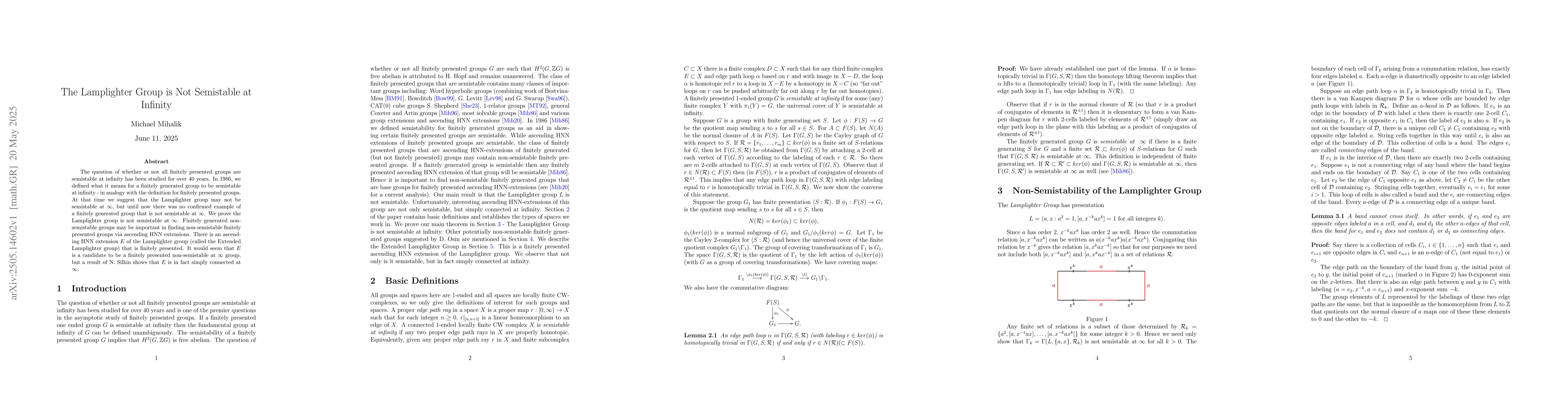 The paper builds upon the definition of semistability at infinity for finitely generated groups, initially proposed in 1986, and applies it to the Lamplighter group.