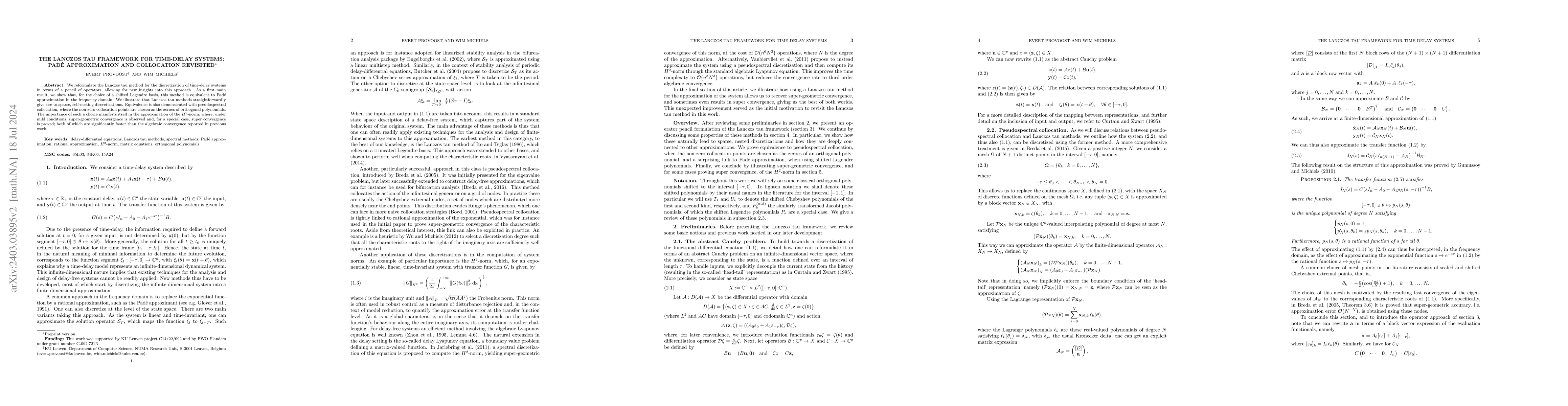 The Lanczos tau method for time-delay systems is reformulated using operator pencils, showing its equivalence to Padé approximation and pseudospectral collocation with orthogonal polynomial zeros, leading to super-geometric convergence in $H^2$-norm approximation.