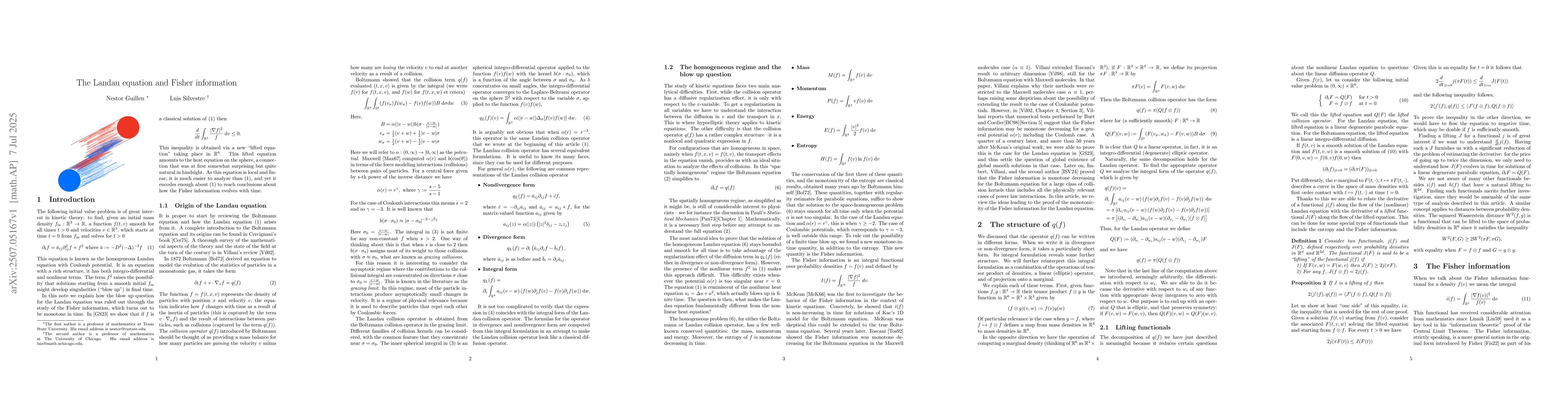 In this expository note (submitted to Notices of the AMS) we present the ideas used in our recent work ruling out blow up for the Landau equation with Coulomb potential. Blow up is ruled out by the discovery that the Fisher information is not increasing in time along a solution. This monotonicity is established by means of a new ``lifted equation'' which is an auxiliary linear equation in double the number of variables that encodes the nonlinear nonlocal collision operator. For the Landau equation in particular this lifted equation amounts to a family of heat equations over the sphere. Some background on kinetic equations and the Fisher information, and connections to Bakry-Emery theory is also discussed.