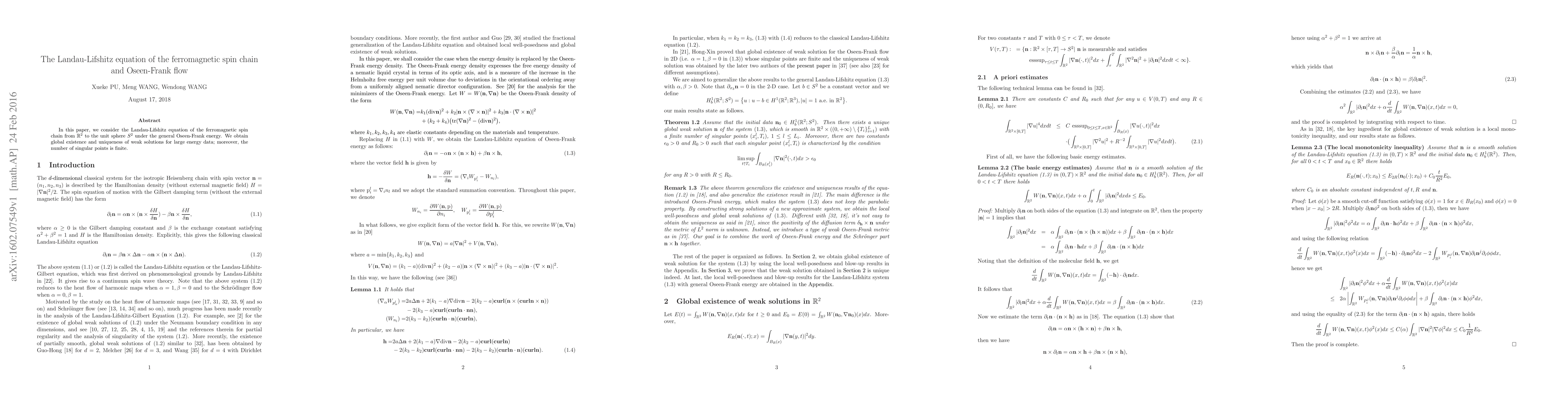 Summary: This paper investigates the Landau-Lifshitz equation for ferromagnetic spin chains, deriving global existence and uniqueness of weak solutions for large energy data under the Oseen-Frank energy. It also proves that the number of singular points in these solutions is finite.