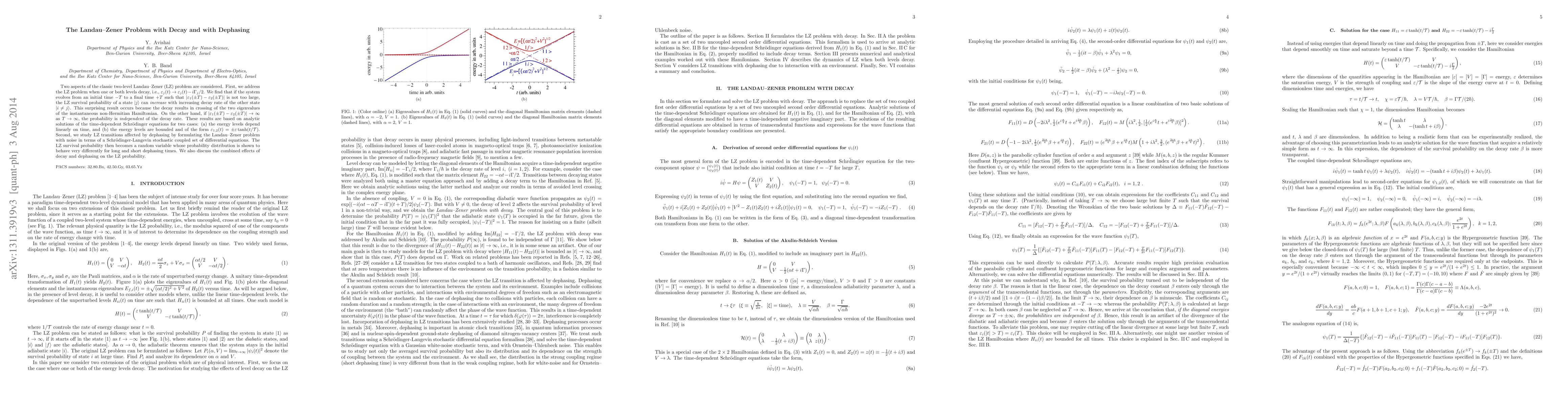 This paper investigates two extensions of the Landau-Zener problem: decay of energy levels and dephasing due to noise. It finds that decay can paradoxically increase the survival probability of a state, while dephasing leads to a stochastic LZ survival probability distribution varying with dephasing time.
