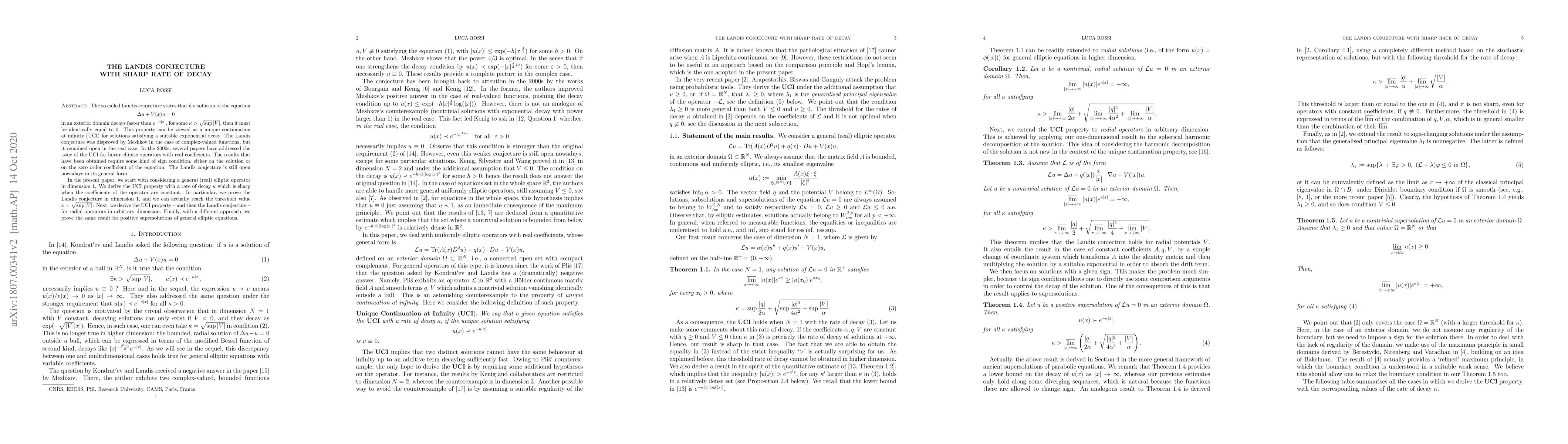 The so called Landis conjecture states that if a solution of the equation $$\Delta u+V(x)u=0$$ in an exterior domain decays faster than $e^{-\kappa|x|}$, for some $\kappa>\sqrt{\sup |V|}$, then it must be identically equal to $0$. This property can be viewed as a unique continuation at infinity (UCI) for solutions satisfying a suitable exponential decay. The Landis conjecture was disproved by Meshkov in the case of complex-valued functions, but it remained open in the real case. In the 2000s, several papers have addressed the issue of the UCI for linear elliptic operators with real coefficients. The results that have been obtained require some kind of sign condition, either on the solution or on the zero order coefficient of the equation. The Landis conjecture is still open nowadays in its general form. In the present paper, we start with considering a general (real) elliptic operator in dimension $1$. We derive the UCI property with a rate of decay $\kappa$ which is sharp when the coefficients of the operator are constant. In particular, we prove the Landis conjecture in dimension $1$, and we can actually reach the threshold value $\kappa=\sqrt{\sup |V|}$. Next, we derive the UCI property -- and then the Landis conjecture -- for radial operators in arbitrary dimension. Finally, with a different approach, we prove the same result for positive supersolutions of general elliptic equations.