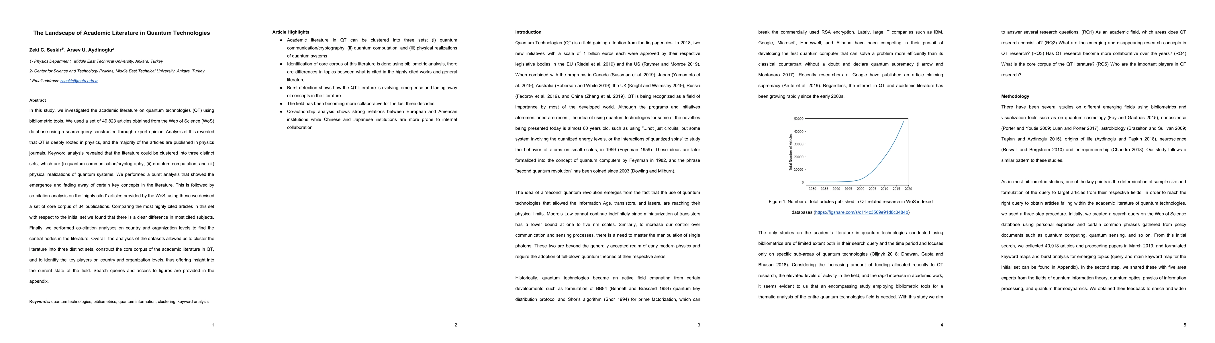 In this study, we investigated the academic literature on quantum technologies (QT) using bibliometric tools. We used a set of 49,823 articles obtained from the Web of Science (WoS) database using a search query constructed through expert opinion. Analysis of this revealed that QT is deeply rooted in physics, and the majority of the articles are published in physics journals. Keyword analysis revealed that the literature could be clustered into three distinct sets, which are (i) quantum communication/cryptography, (ii) quantum computation, and (iii) physical realizations of quantum systems. We performed a burst analysis that showed the emergence and fading away of certain key concepts in the literature. This is followed by co-citation analysis on the highly cited articles provided by the WoS, using these we devised a set of core corpus of 34 publications. Comparing the most highly cited articles in this set with respect to the initial set we found that there is a clear difference in most cited subjects. Finally, we performed co-citation analyses on country and organization levels to find the central nodes in the literature. Overall, the analyses of the datasets allowed us to cluster the literature into three distinct sets, construct the core corpus of the academic literature in QT, and to identify the key players on country and organization levels, thus offering insight into the current state of the field. Search queries and access to figures are provided in the appendix.