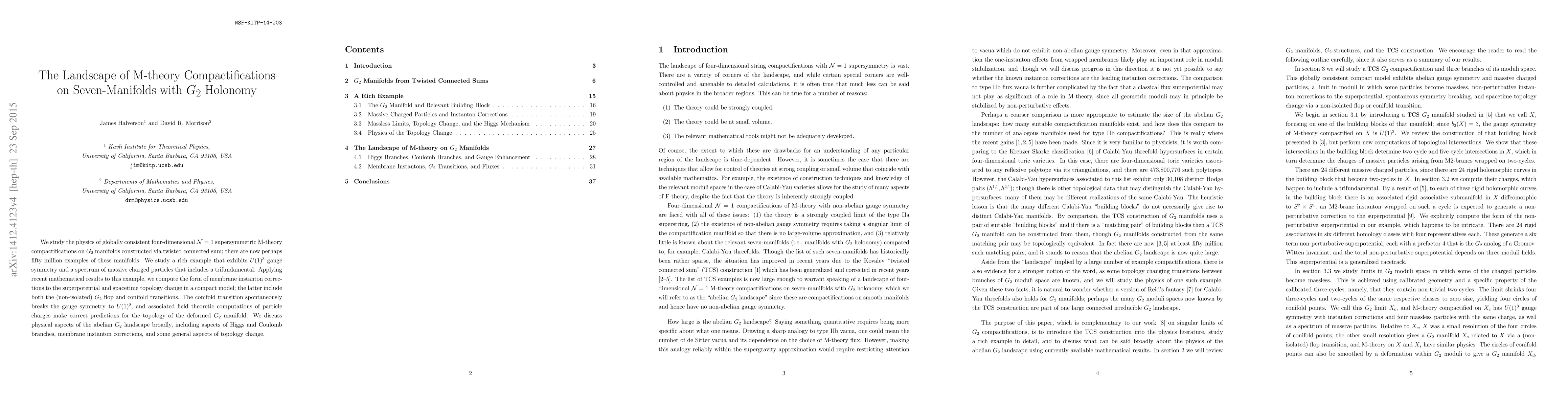 We study the physics of globally consistent four-dimensional $\mathcal{N}=1$ supersymmetric M-theory compactifications on $G_2$ manifolds constructed via twisted connected sum; there are now perhaps fifty million examples of these manifolds. We study a rich example that exhibits $U(1)^3$ gauge symmetry and a spectrum of massive charged particles that includes a trifundamental. Applying recent mathematical results to this example, we compute membrane instanton corrections to the superpotential and spacetime topology change in a compact model; the latter include both the (non-isolated) $G_2$ flop and conifold transitions. The conifold transition spontaneously breaks the gauge symmetry to $U(1)^2$, and associated field theoretic computations of particle charges make correct predictions for the topology of the deformed $G_2$ manifold. We discuss physical aspects of the abelian $G_2$ landscape broadly, including aspects of Higgs and Coulomb branches, membrane instanton corrections, and some general aspects of topology change.