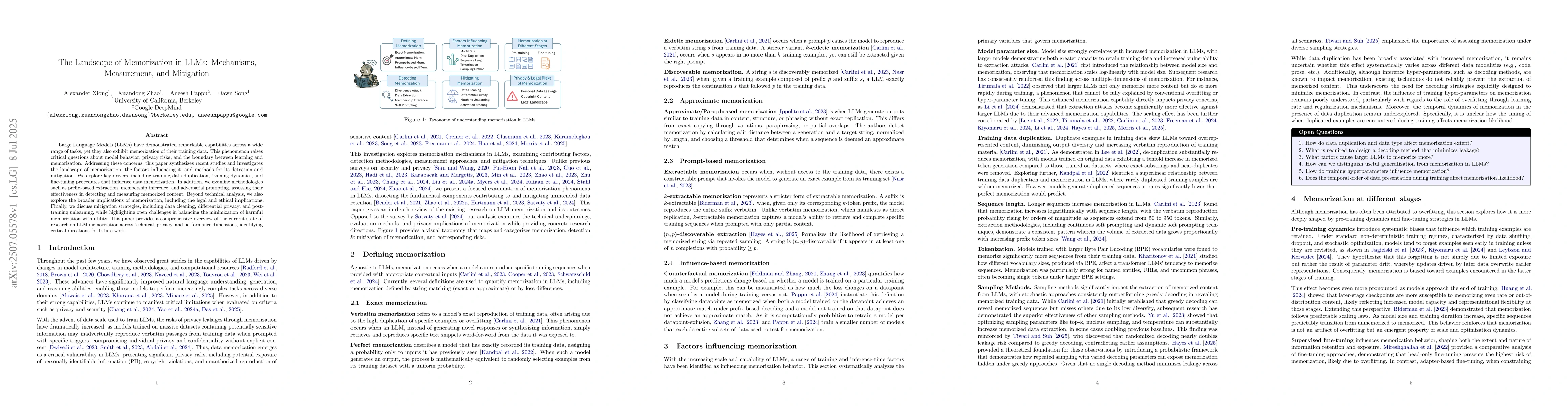 Large Language Models (LLMs) have demonstrated remarkable capabilities across a wide range of tasks, yet they also exhibit memorization of their training data. This phenomenon raises critical questions about model behavior, privacy risks, and the boundary between learning and memorization. Addressing these concerns, this paper synthesizes recent studies and investigates the landscape of memorization, the factors influencing it, and methods for its detection and mitigation. We explore key drivers, including training data duplication, training dynamics, and fine-tuning procedures that influence data memorization. In addition, we examine methodologies such as prefix-based extraction, membership inference, and adversarial prompting, assessing their effectiveness in detecting and measuring memorized content. Beyond technical analysis, we also explore the broader implications of memorization, including the legal and ethical implications. Finally, we discuss mitigation strategies, including data cleaning, differential privacy, and post-training unlearning, while highlighting open challenges in balancing the minimization of harmful memorization with utility. This paper provides a comprehensive overview of the current state of research on LLM memorization across technical, privacy, and performance dimensions, identifying critical directions for future work.