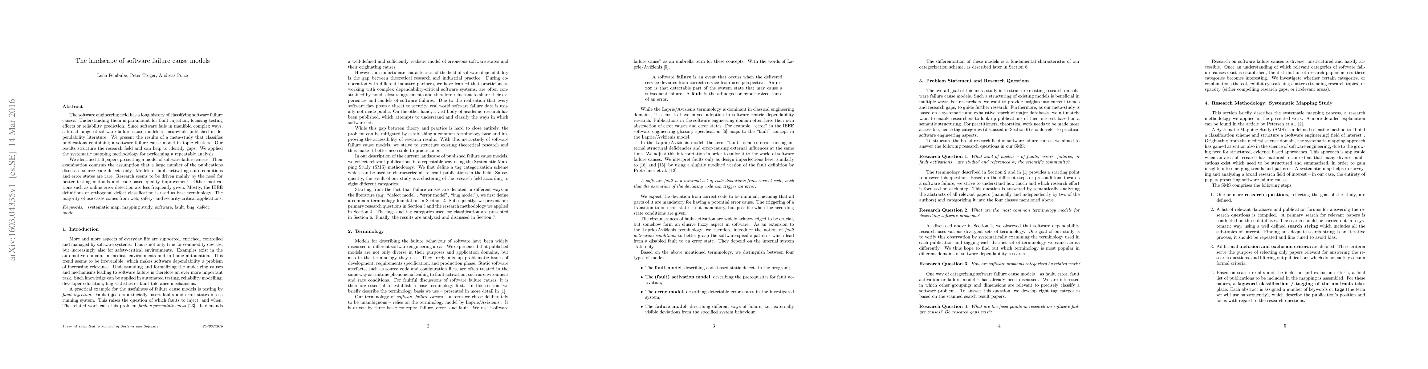 The software engineering field has a long history of classifying software failure causes. Understanding them is paramount for fault injection, focusing testing efforts or reliability prediction. Since software fails in manifold complex ways, a broad range of software failure cause models is meanwhile published in dependability literature. We present the results of a meta-study that classifies publications containing a software failure cause model in topic clusters. Our results structure the research field and can help to identify gaps. We applied the systematic mapping methodology for performing a repeatable analysis. We identified 156 papers presenting a model of software failure causes. Their examination confirms the assumption that a large number of the publications discusses source code defects only. Models of fault-activating state conditions and error states are rare. Research seems to be driven mainly by the need for better testing methods and code-based quality improvement. Other motivations such as online error detection are less frequently given. Mostly, the IEEE definitions or orthogonal defect classification is used as base terminology. The majority of use cases comes from web, safety- and security-critical applications.