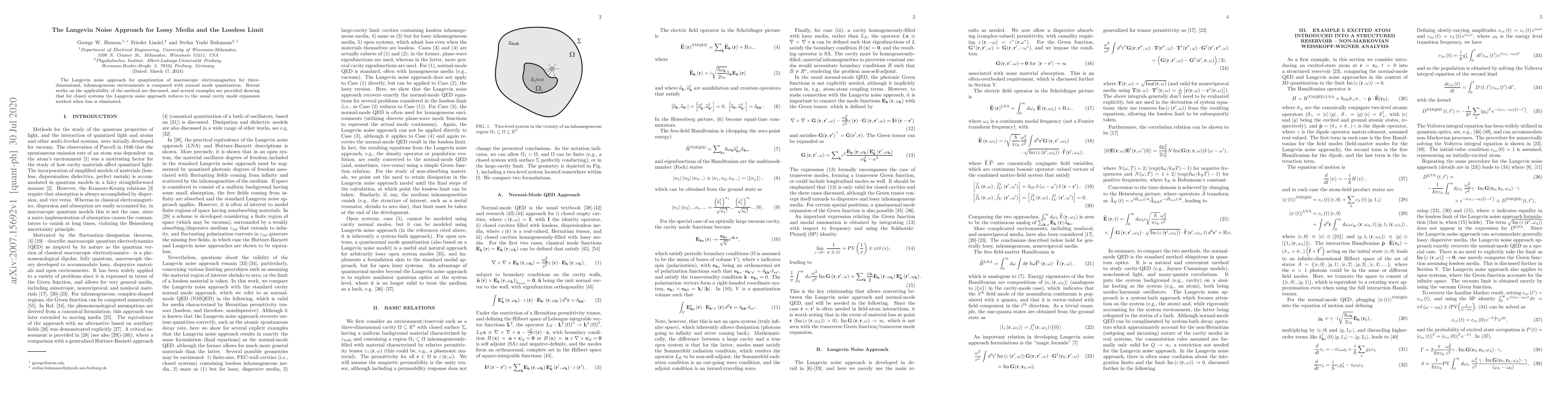 The Langevin noise approach for quantization of macroscopic electromagnetics for three-dimensional, inhomogeneous environments is compared with normal mode quantization. Recent works on the applicability of the method are discussed, and several examples are provided showing that for closed systems the Langevin noise approach reduces to the usual cavity mode expansion method when loss is eliminated.