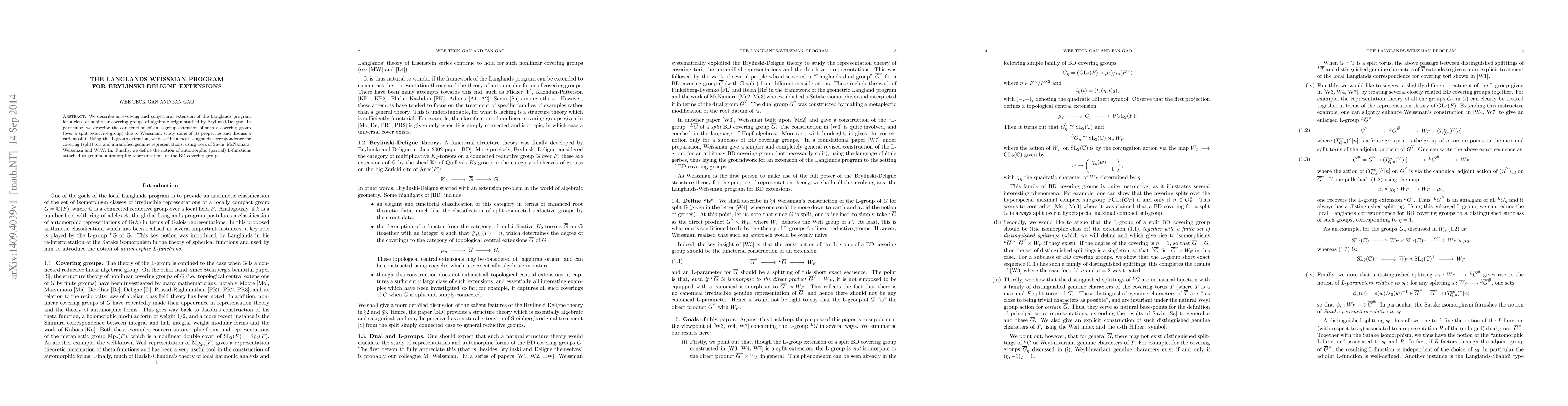 This paper explores an extension of the Langlands program for Brylinski-Deligne covering groups, constructing an L-group extension by Weissman and discussing its properties. It also establishes a local Langlands correspondence and defines automorphic L-functions for genuine representations of these groups.