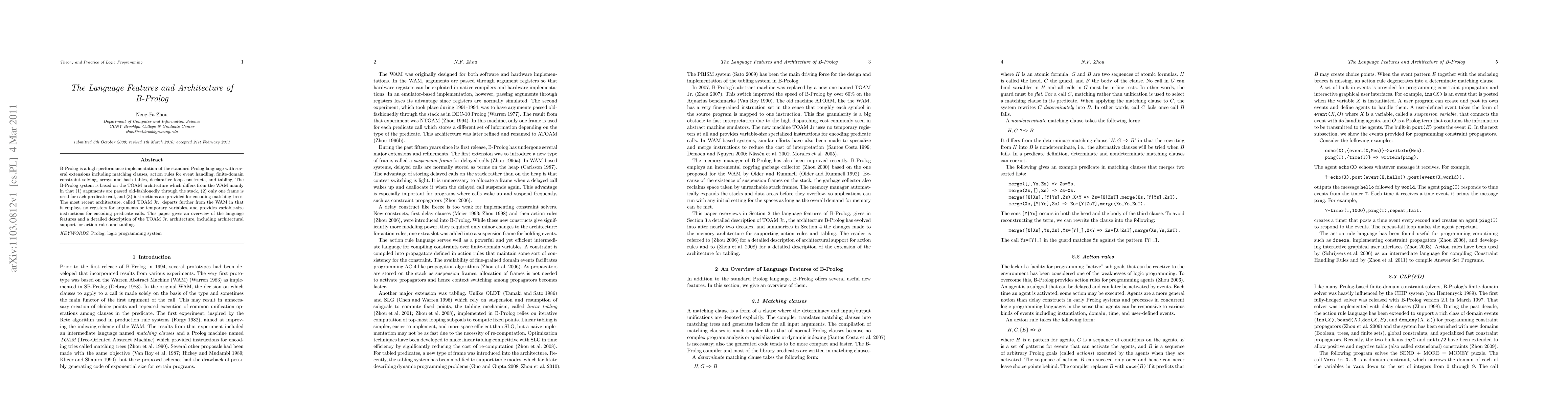 The research paper describes the language features and architecture of B-Prolog, a high-performance Prolog implementation with extensions like matching clauses, action rules, finite-domain constraint solving, arrays, hash tables, declarative loop constructs, and tabling. It details the TOAM Jr. architecture, which differs from the WAM by using a stack for argument passing, employing only one frame per predicate call, and providing instructions for encoding matching trees.