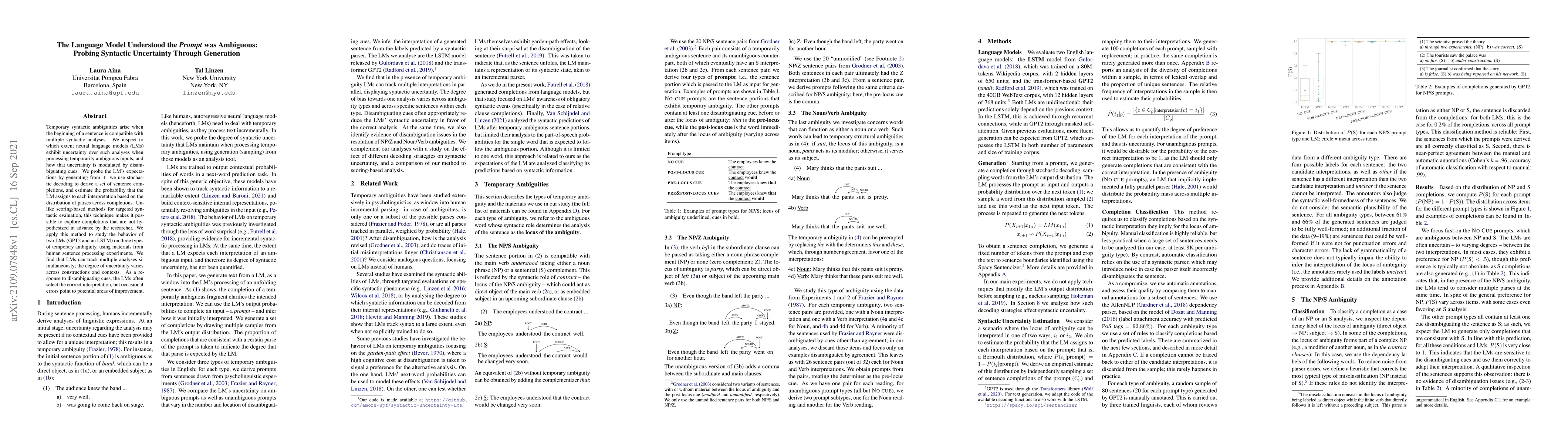 This paper investigates how neural language models handle temporary syntactic ambiguities by generating sentence completions and estimating the model's uncertainty over different syntactic analyses. The study finds that models like GPT2 and LSTM can track multiple syntactic interpretations, though their uncertainty varies and they occasionally make errors in selecting interpretations.