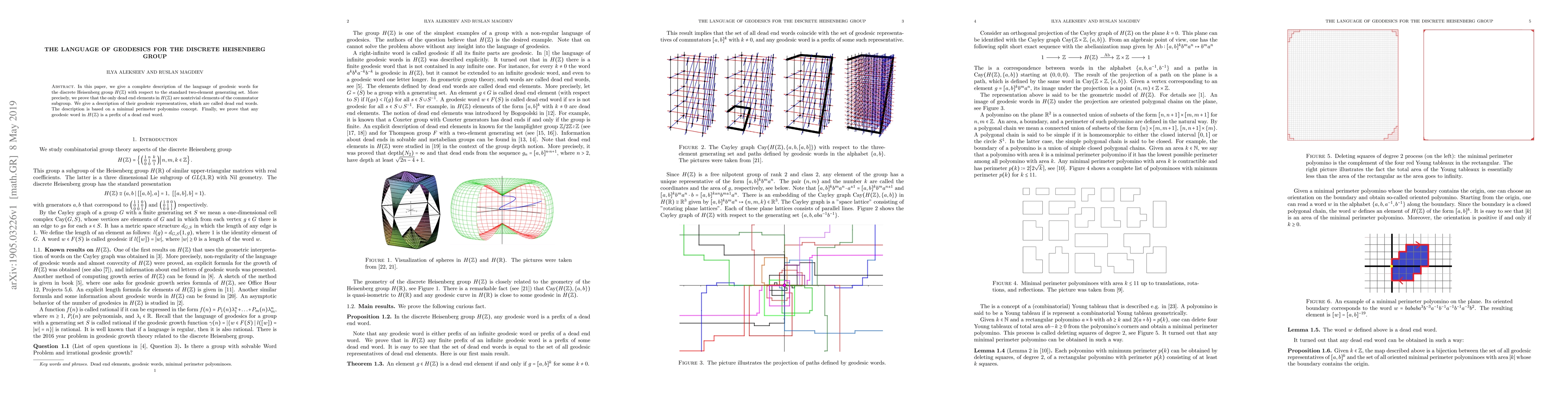 In this paper, we give a complete description of the language of geodesic words for the discrete Heisenberg group $H(\mathbb{Z})$ with respect to the standard two-element generating set. More precisely, we prove that the only dead end elements in $H(\mathbb{Z})$ are nontrivial elements of the commutator subgroup. We give a description of their geodesic representatives, which are called dead end words. The description is based on a minimal perimeter polyomino concept. Finally, we prove that any geodesic word in $H(\mathbb{Z})$ is a prefix of a dead end word.