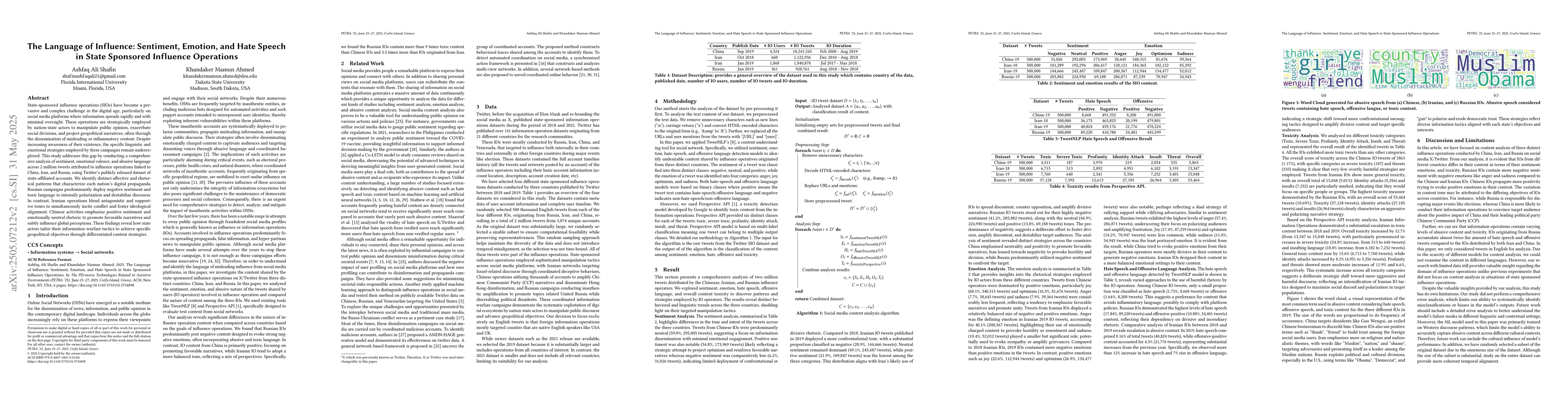 Advanced analysis techniques for identifying sentiment, emotion, and abusive language in state-sponsored influence operations on social media.