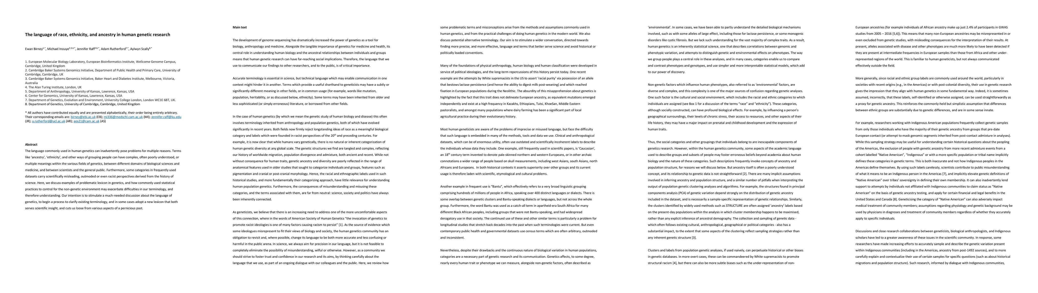 This paper discusses the problematic language used in human genetics, particularly terms like "ancestry" and "ethnicity," which can have multiple, often misunderstood meanings across different scientific fields and between scientists and the public. It highlights the need for clearer terminology to avoid scientifically misleading and historically racist categorizations, advocating for a discussion to reform and clarify genetic lexicon for better scientific understanding and to move past a problematic past.