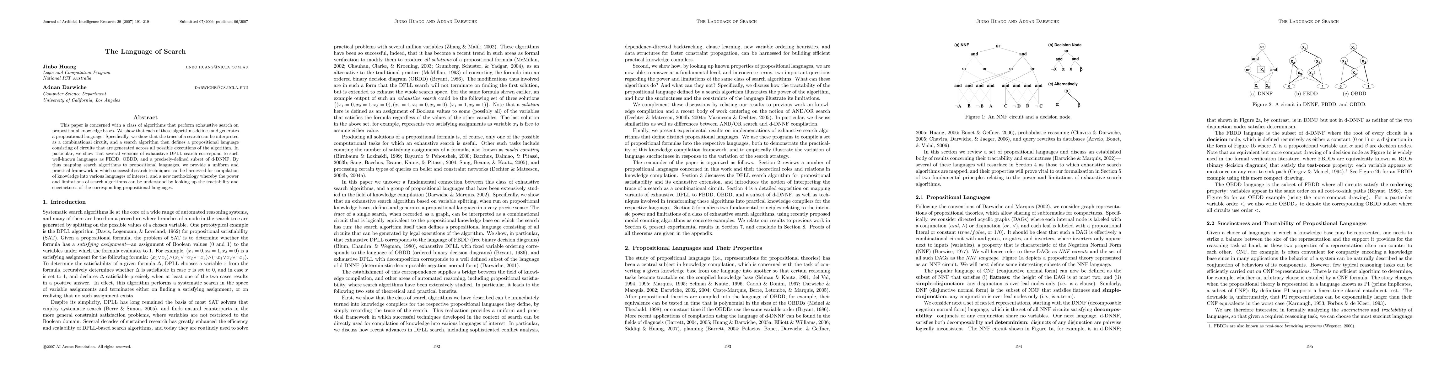 This paper is concerned with a class of algorithms that perform exhaustive search on propositional knowledge bases. We show that each of these algorithms defines and generates a propositional language. Specifically, we show that the trace of a search can be interpreted as a combinational circuit, and a search algorithm then defines a propositional language consisting of circuits that are generated across all possible executions of the algorithm. In particular, we show that several versions of exhaustive DPLL search correspond to such well-known languages as FBDD, OBDD, and a precisely-defined subset of d-DNNF. By thus mapping search algorithms to propositional languages, we provide a uniform and practical framework in which successful search techniques can be harnessed for compilation of knowledge into various languages of interest, and a new methodology whereby the power and limitations of search algorithms can be understood by looking up the tractability and succinctness of the corresponding propositional languages.