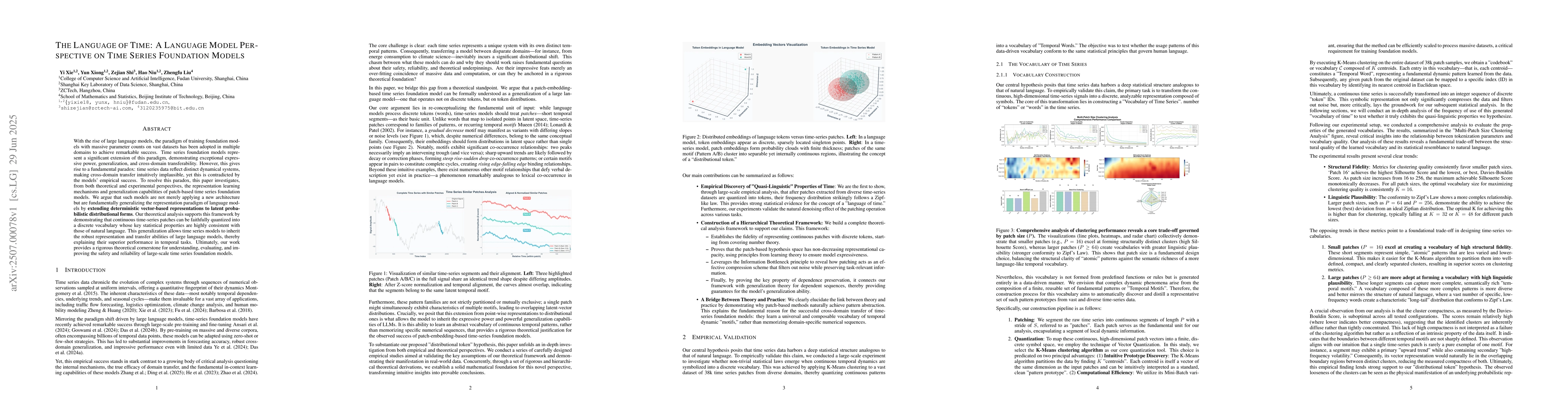 With the rise of large language models, the paradigm of training foundation models with massive parameter counts on vast datasets has been adopted in multiple domains to achieve remarkable success. Time series foundation models represent a significant extension of this paradigm, demonstrating exceptional expressive power, generalization, and cross-domain transferability. However, this gives rise to a fundamental paradox: time series data reflect distinct dynamical systems, making cross-domain transfer intuitively implausible, yet this is contradicted by the models' empirical success. To resolve this paradox, this paper investigates, from both theoretical and experimental perspectives, the representation learning mechanisms and generalization capabilities of patch-based time series foundation models. We argue that such models are not merely applying a new architecture but are fundamentally generalizing the representation paradigm of language models by extending deterministic vector-based representations to latent probabilistic distributional forms. Our theoretical analysis supports this framework by demonstrating that continuous time-series patches can be faithfully quantized into a discrete vocabulary whose key statistical properties are highly consistent with those of natural language. This generalization allows time series models to inherit the robust representation and transfer abilities of large language models, thereby explaining their superior performance in temporal tasks. Ultimately, our work provides a rigorous theoretical cornerstone for understanding, evaluating, and improving the safety and reliability of large-scale time series foundation models.