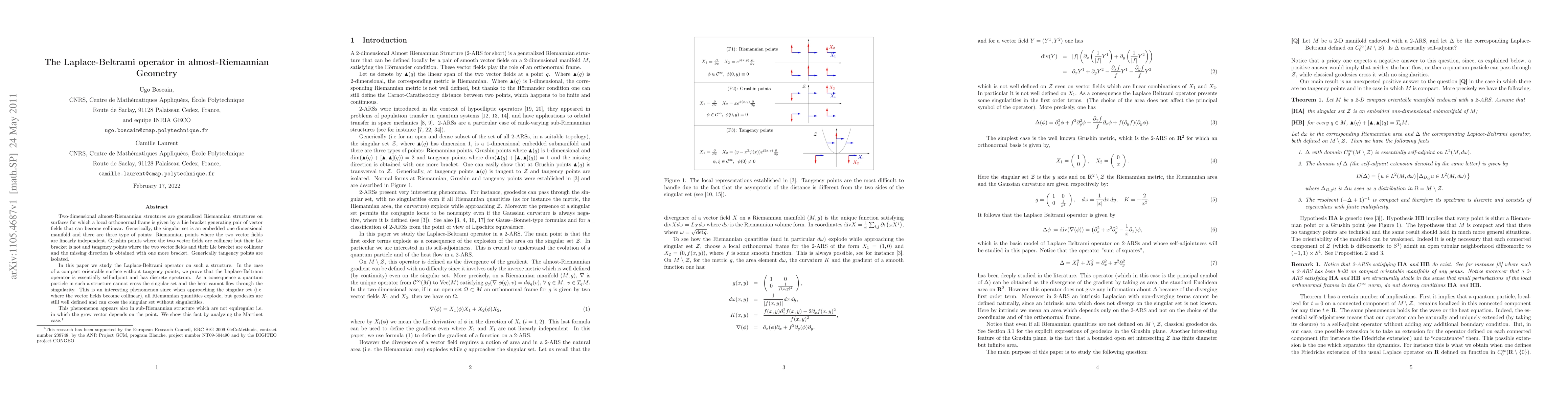 This paper investigates the Laplace-Beltrami operator on two-dimensional almost-Riemannian structures, revealing that it is essentially self-adjoint with discrete spectrum on compact orientable surfaces without tangency points, preventing quantum particle crossing of singularities. Despite Riemannian quantities exploding as one approaches singularities, geodesics remain well-defined.