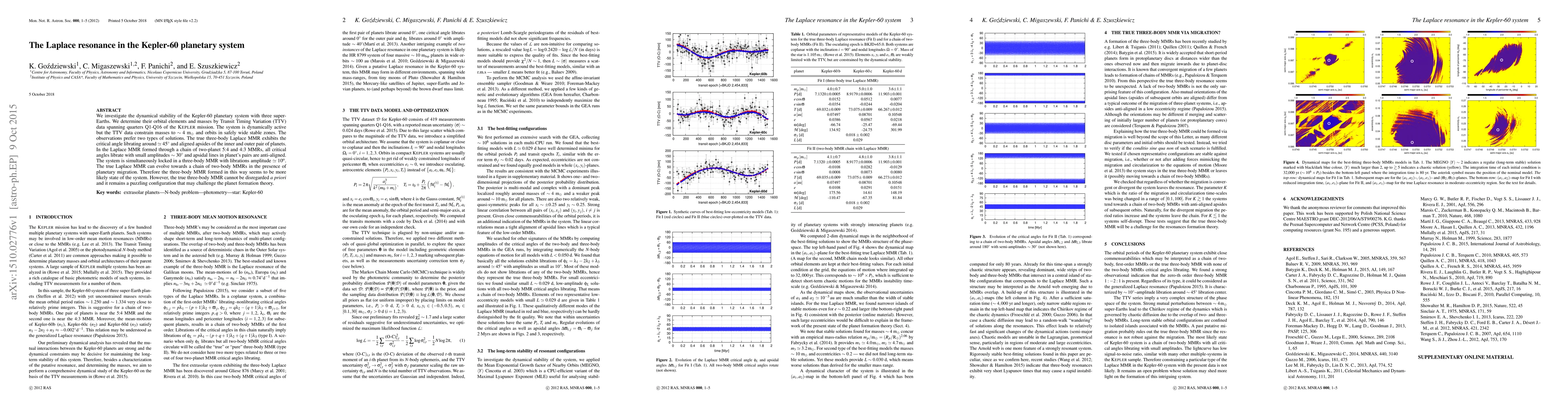 We investigate the dynamical stability of the Kepler-60 planetary system with three super-Earths. We first determine their orbital elements and masses by Transit Timing Variation (TTV) data spanning quarters Q1-Q16 of the KEPLER mission. The system is dynamically active but the TTV data constrain masses to ~4 Earth masses and orbits in safely wide stable zones. The observations prefer two types of solutions. The true three-body Laplace MMR exhibits the critical angle librating around 45 degrees and aligned apsides of the inner and outer pair of planets. In the Laplace MMR formed through a chain of two-planet 5:4 and 4:3 MMRs, all critical angles librate with small amplitudes of ~30 degrees and apsidal lines in planet's pairs are anti-aligned. The system is simultaneously locked in a three-body MMR with librations amplitude of ~10 degrees. The true Laplace MMR can evolve towards a chain of two-body MMRs in the presence of planetary migration. Therefore the three-body MMR formed in this way seems to be more likely state of the system. However, the true three-body MMR cannot be disregarded a priori and it remains a puzzling configuration that may challenge the planet formation theory.