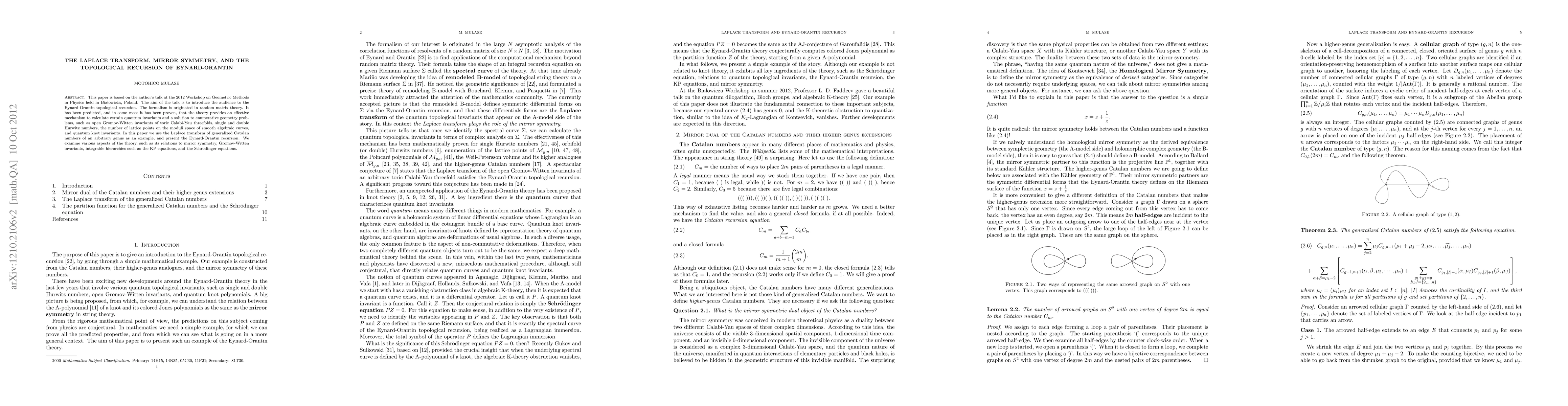 This paper introduces the Eynard-Orantin topological recursion, a formalism from random matrix theory, which is used to compute quantum invariants and solve enumerative geometry problems. The authors illustrate its application through the Laplace transform of generalized Catalan numbers, and discuss its connections to mirror symmetry and integrable hierarchies.