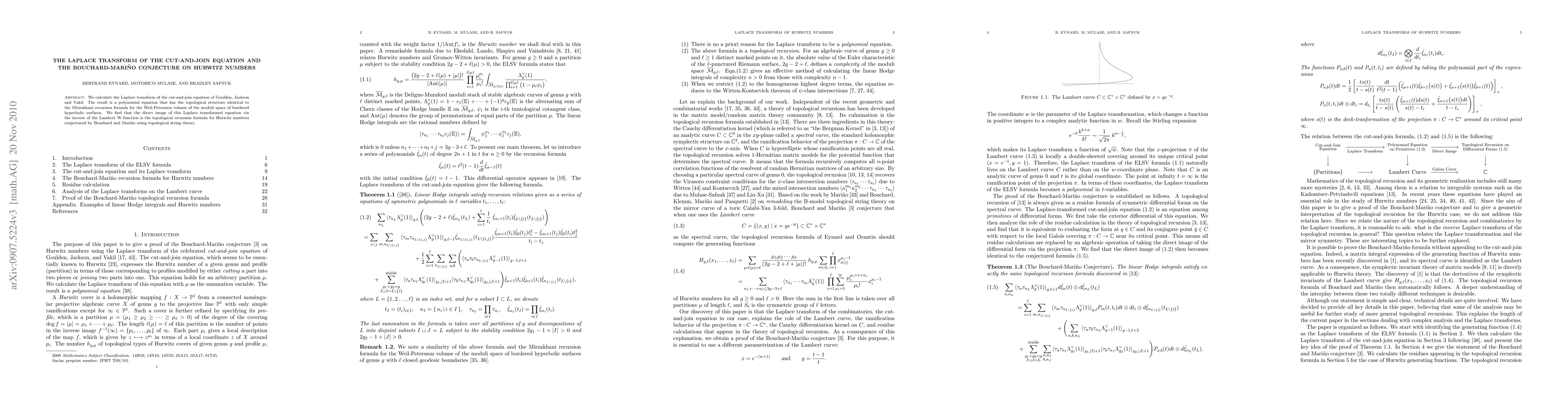 The paper calculates the Laplace transform of a cut-and-join equation and finds it is equivalent to the topological recursion formula for Hurwitz numbers, supporting Bouchard-Marino's conjecture.