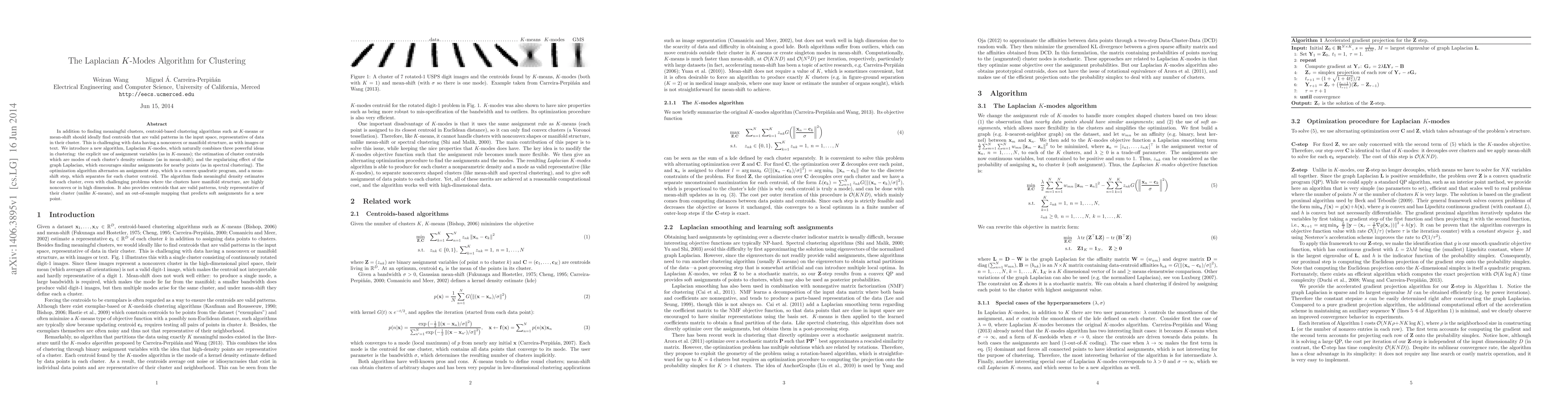 In addition to finding meaningful clusters, centroid-based clustering algorithms such as K-means or mean-shift should ideally find centroids that are valid patterns in the input space, representative of data in their cluster. This is challenging with data having a nonconvex or manifold structure, as with images or text. We introduce a new algorithm, Laplacian K-modes, which naturally combines three powerful ideas in clustering: the explicit use of assignment variables (as in K-means); the estimation of cluster centroids which are modes of each cluster's density estimate (as in mean-shift); and the regularizing effect of the graph Laplacian, which encourages similar assignments for nearby points (as in spectral clustering). The optimization algorithm alternates an assignment step, which is a convex quadratic program, and a mean-shift step, which separates for each cluster centroid. The algorithm finds meaningful density estimates for each cluster, even with challenging problems where the clusters have manifold structure, are highly nonconvex or in high dimension. It also provides centroids that are valid patterns, truly representative of their cluster (unlike K-means), and an out-of-sample mapping that predicts soft assignments for a new point.