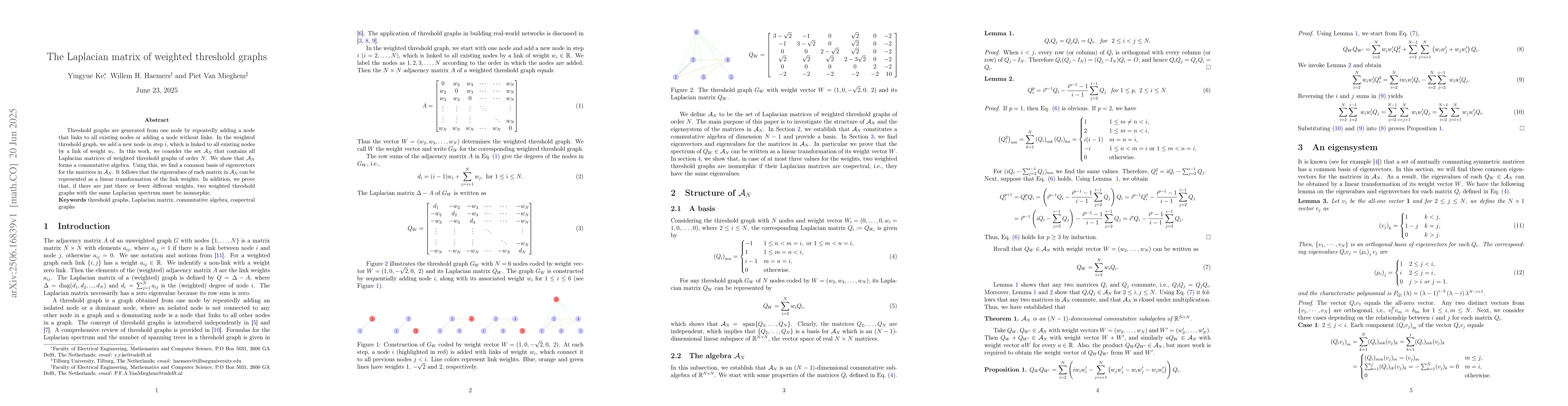 This paper explores weighted threshold graphs, demonstrating that their Laplacian matrices form a commutative algebra. A common basis of eigenvectors is identified, allowing eigenvalues to be expressed as a function of link weights. The study concludes that weighted threshold graphs with the same Laplacian spectrum are isomorphic if there are three or fewer distinct weights.