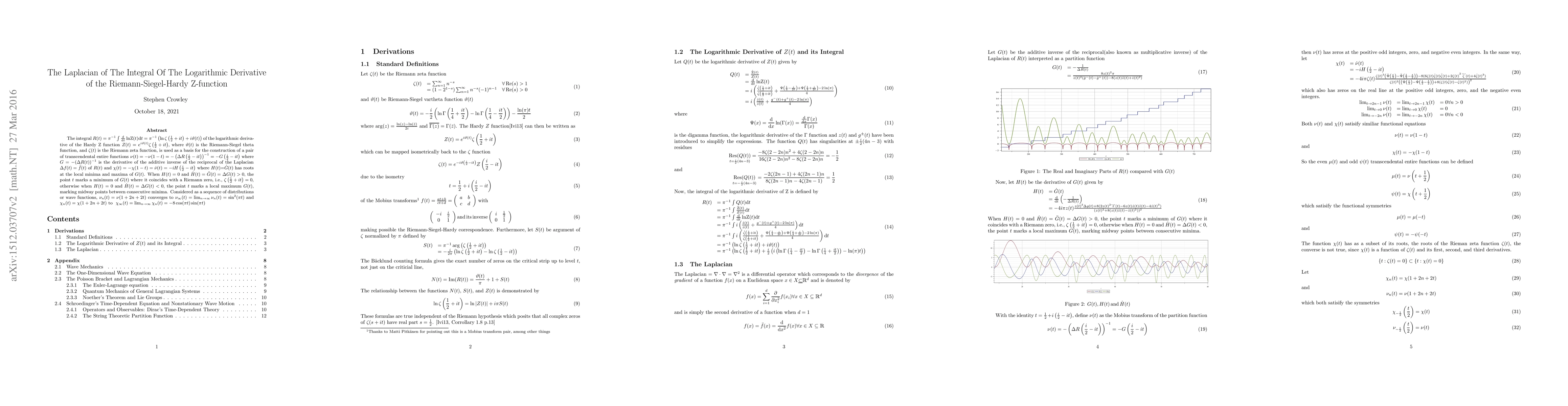 The integral $R(t)={\pi}^{-1}(ln{\zeta}(\frac{1}{2}+it)+i\vartheta (t))$ of the logarithmic derivative of the Hardy Z function $Z(t)=e^{i\vartheta (t)}{\zeta}(\frac{1}{2}+it)$, where $\vartheta (t)$ is the Riemann-Siegel theta function, and $\zeta (t)$ is the Riemann zeta function, is used as a basis for the construction of a pair of transcendental entire functions $\nu(t)=-\nu(1-t)=-{\Delta R(\frac{i}{2}-it)}^{-1}=-G(\frac{i}{2}-it)$ where $G=-({\Delta}R(t))^{-1}$ is the derivative of the additive inverse of the reciprocal of the Laplacian of $R(t)$ and $\chi(t)=-\chi(1-t)=\dot{\nu} (t)=-iH(\frac{i}{2}-it)$ where $H(t)=\dot{G} (t)$ has roots at the local minima and maxima of $G(t)$. When $H(t)=0$ and $\dot{H} (t)=\ddot{G} (t)={\Delta}G(t)>0$, the point $t$ marks a minimum of $G(t)$ where it coincides with a Riemann zero, i.e., $\zeta(\frac{1}{2}+it)=0$, otherwise when $H(t)=0$ and $\dot{H} (t)={\Delta}G(t)<0$, the point $t$ marks a local maximum of $G(t)$, marking midway points between consecutive minima. Considered as a sequence of distributions or wave functions, $\nu_n(t)=\nu(1+2n+2t)$ converges to $\nu_\infty (t)=lim_{n \rightarrow \infty} \nu_n (t)={\sin}^2(\pi t)$ and $\chi_n(t)=\chi(1+2n+2t)$ to $\chi_\infty (t)=lim_{n \rightarrow \infty} \chi_n (t)=-8 \cos(\pi t) \sin(\pi t)$