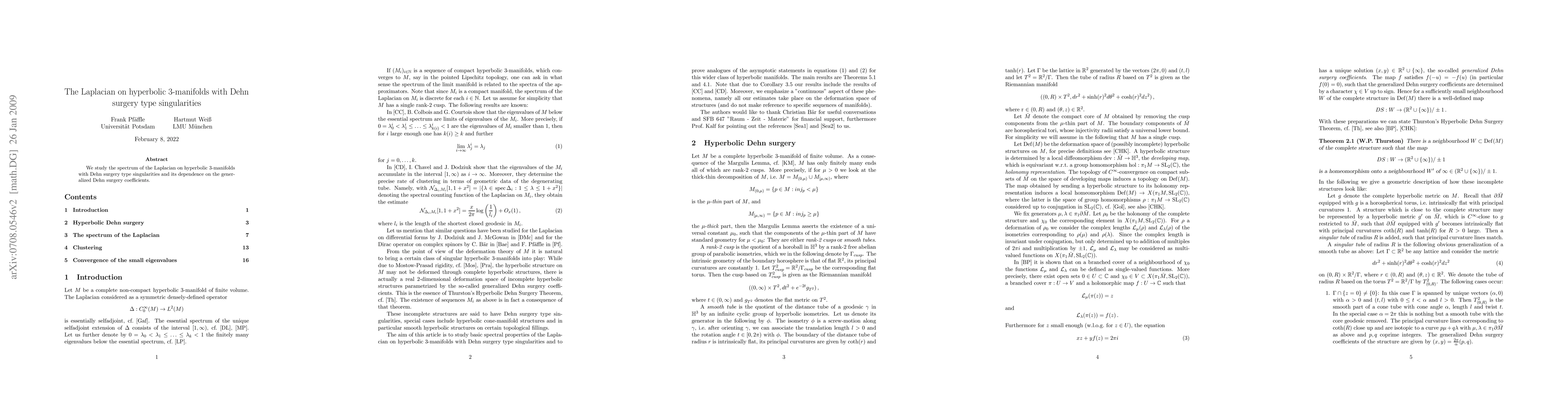 Summary: This paper investigates the spectral properties of the Laplacian on hyperbolic 3-manifolds that possess singularities akin to Dehn surgery, focusing on how these spectral characteristics relate to the specific surgery coefficients used.